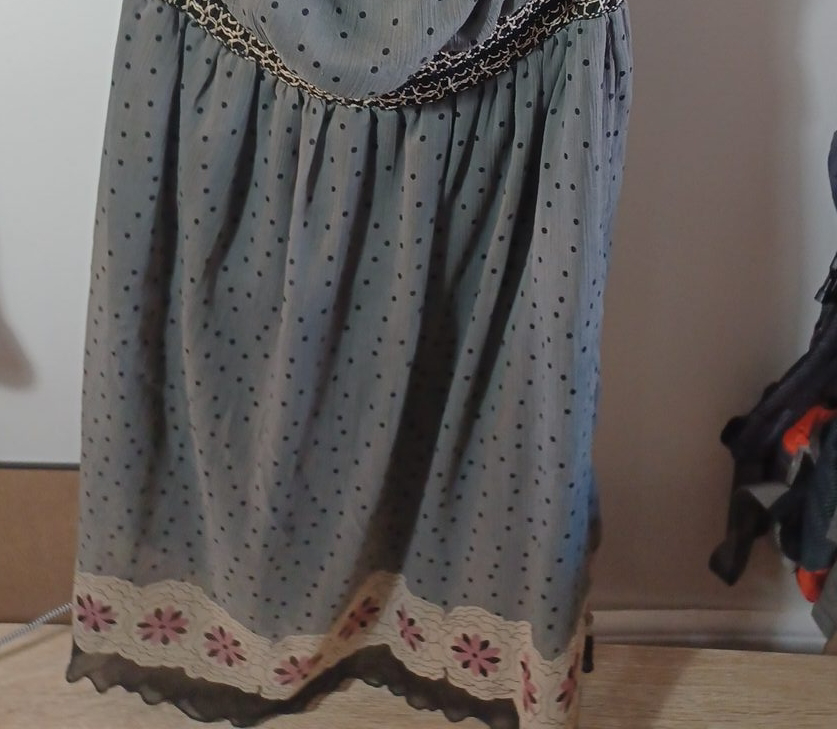 75A cute grey dress with black polka dots and a floral lace trim. It's in good condition and ready for a new home!