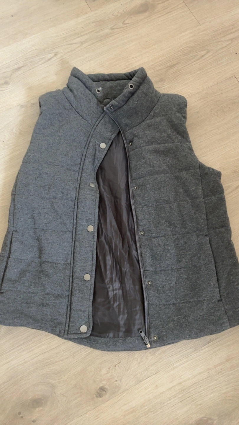 Here's a cozy grey puffer vest! It's in great condition and perfect for layering during the cooler months. The vest features a zipper and button closure, and a stylish high neck.