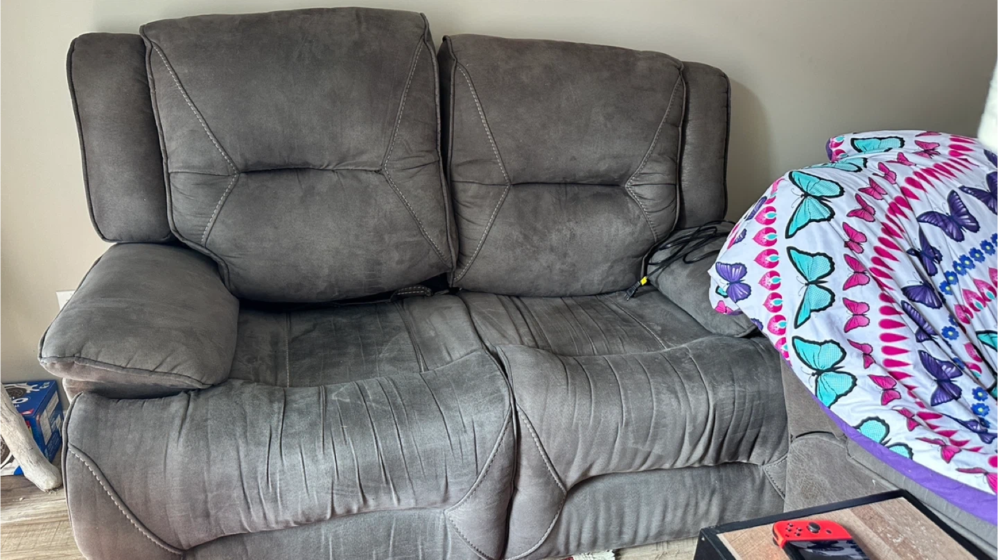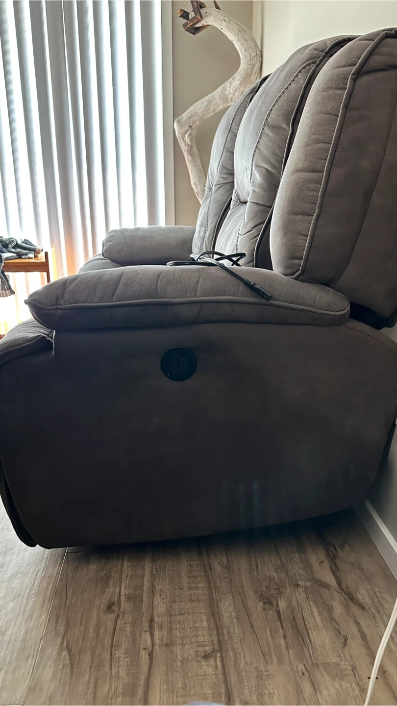 Selling a comfy grey power reclining loveseat. It's in good condition and ready for a new home. Perfect for relaxing and watching movies! taken apart for easy loading. base is one piece.