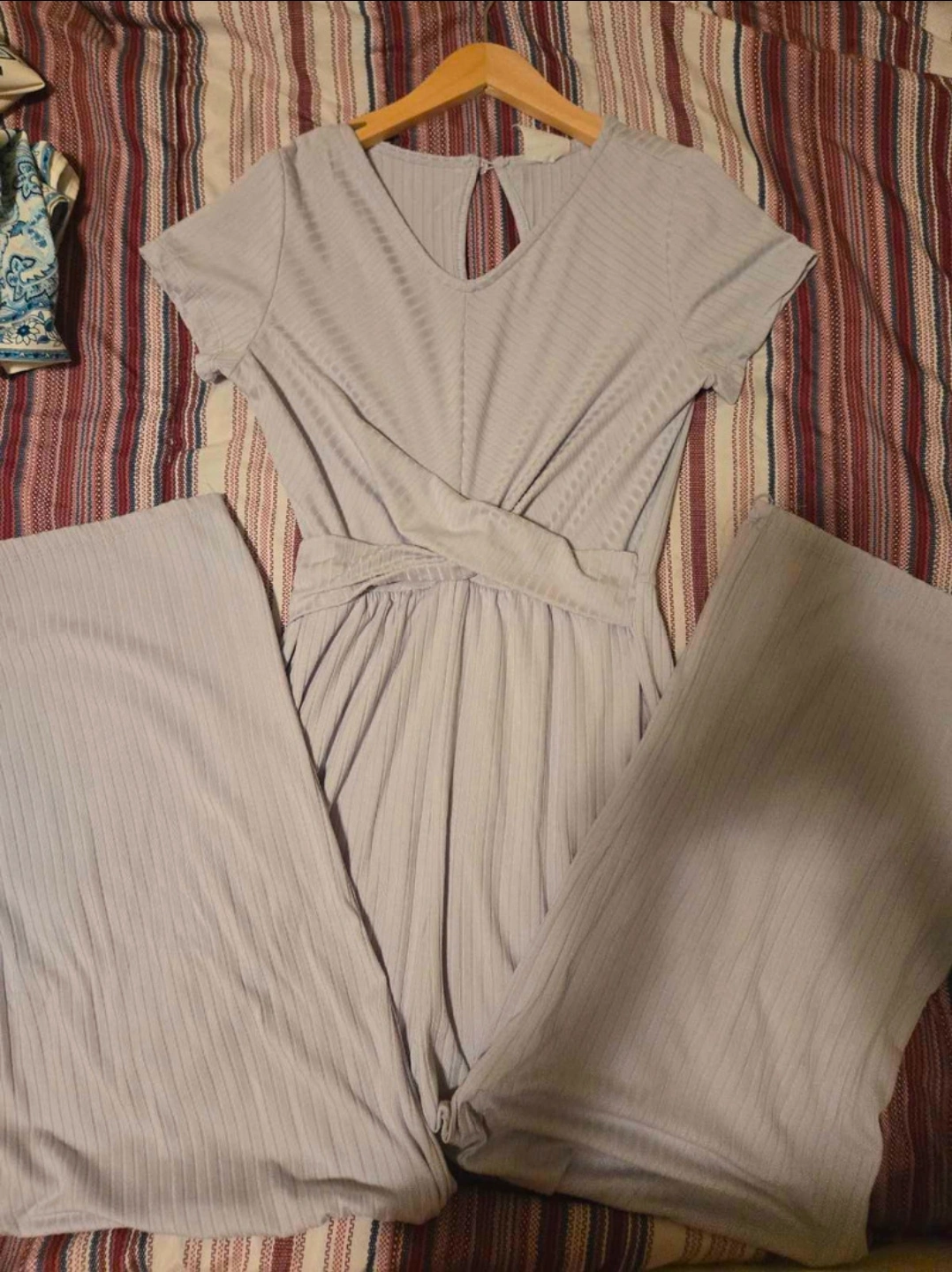 10Selling a comfy grey ribbed jumpsuit! It features a v-neck and a tie detail at the waist. Perfect for a casual day out or lounging at home