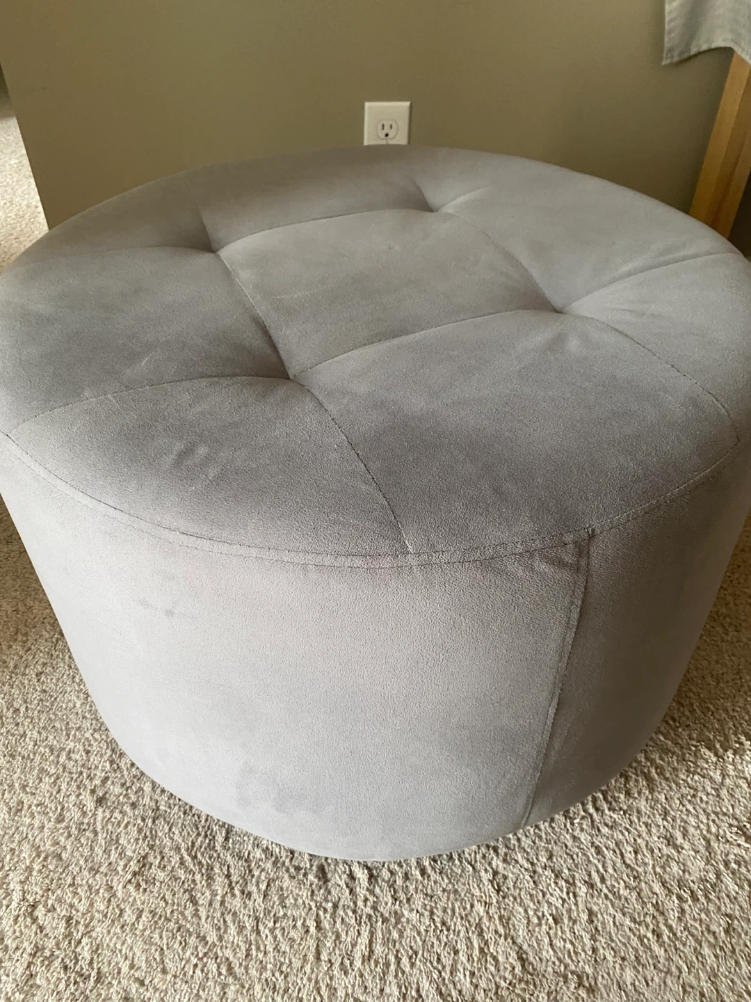 153Selling a comfy, round ottoman in a neutral grey colour! It's in great shape and would be perfect as a footrest or extra seating in any room of the house. The soft material makes it super cozy, and it's just the right size to tuck away when you don't need it