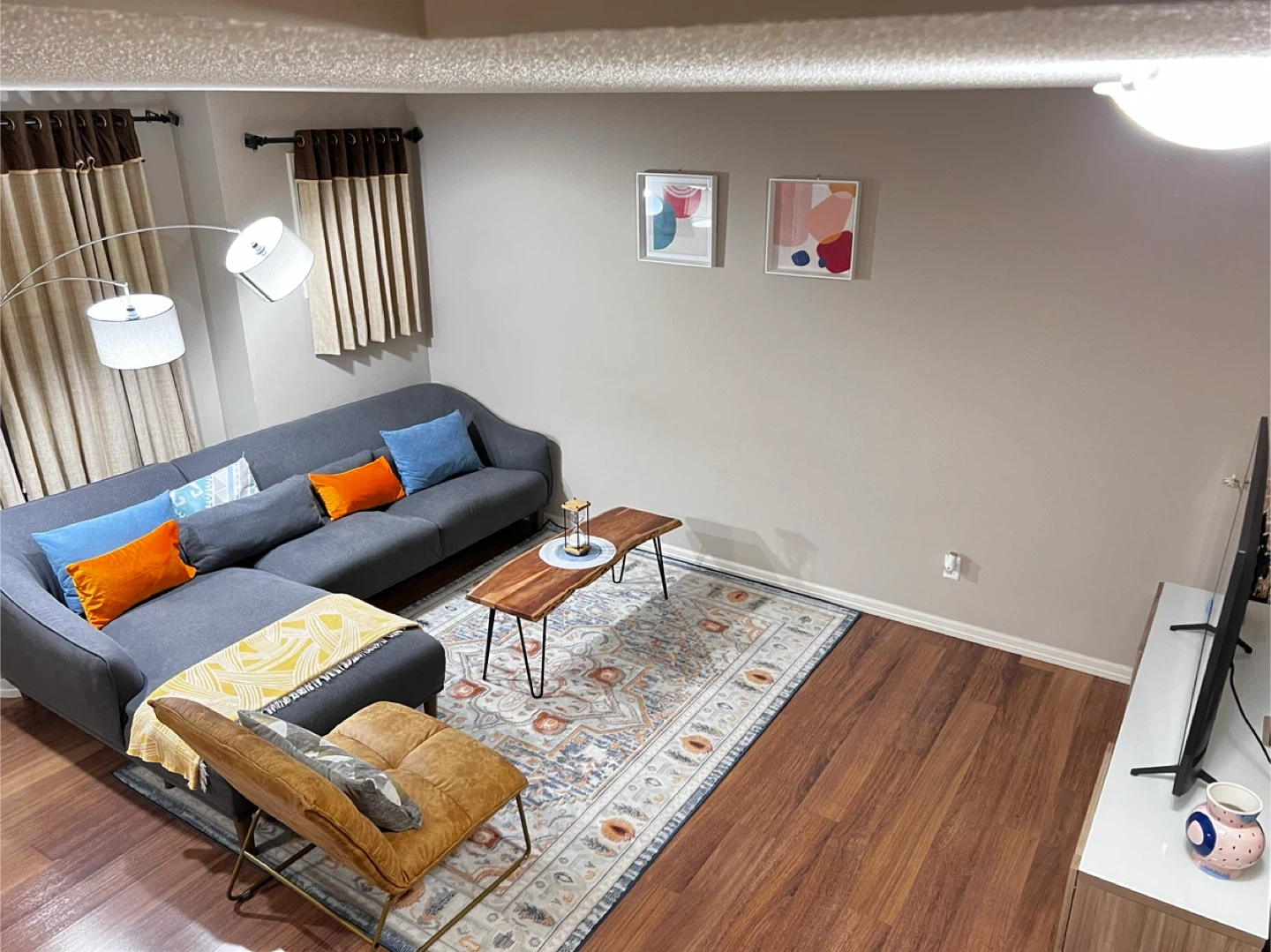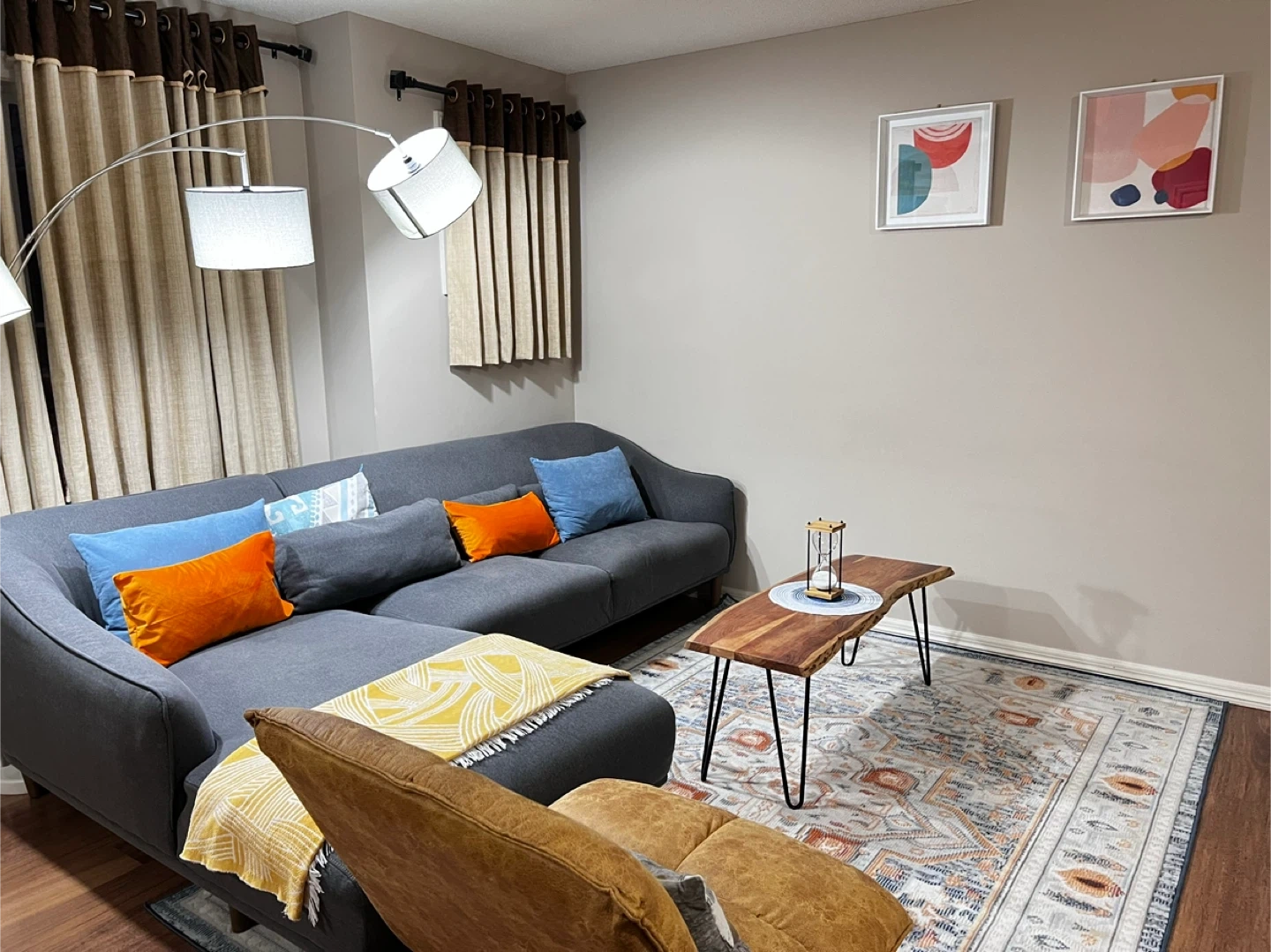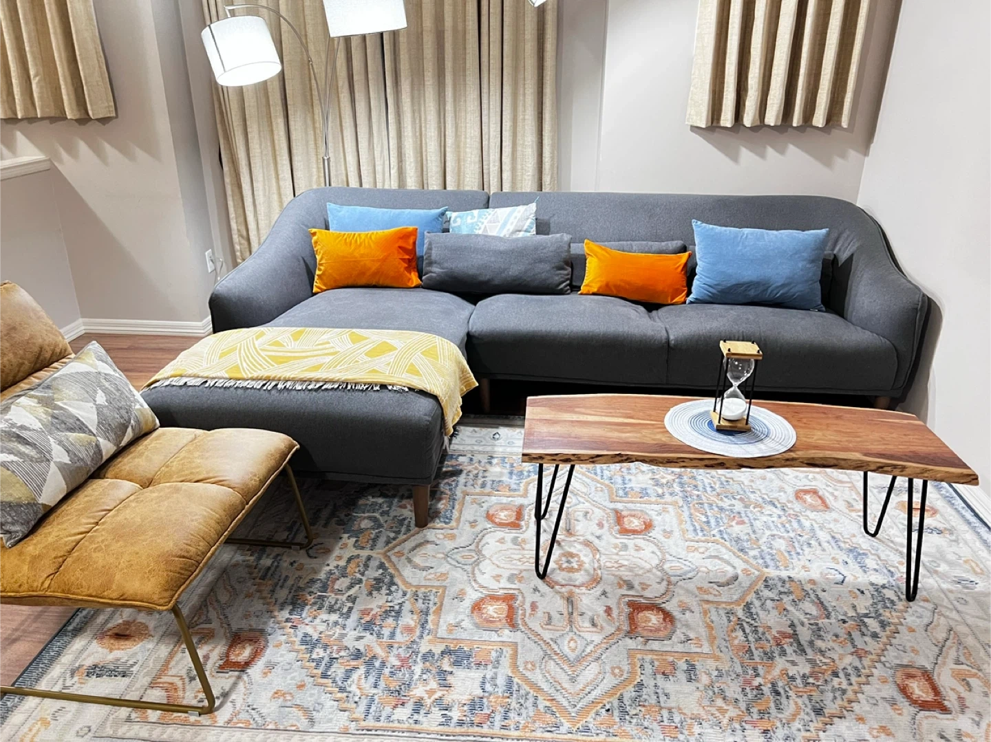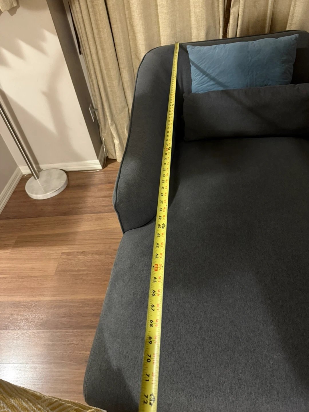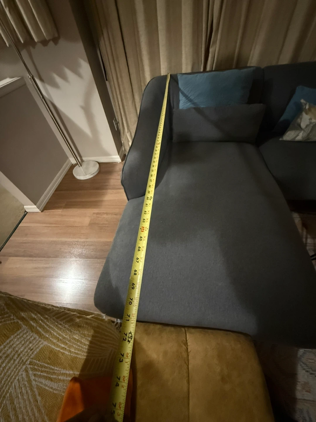 Selling a comfy grey sectional sofa! The dimensions are approximately 72 inches by 107 inches. It's in great shape and would be a perfect addition to any living room. Used for Airbnb! Needs to go ASAP!