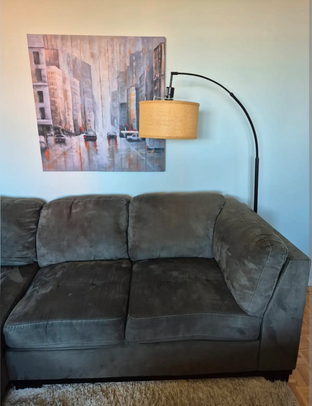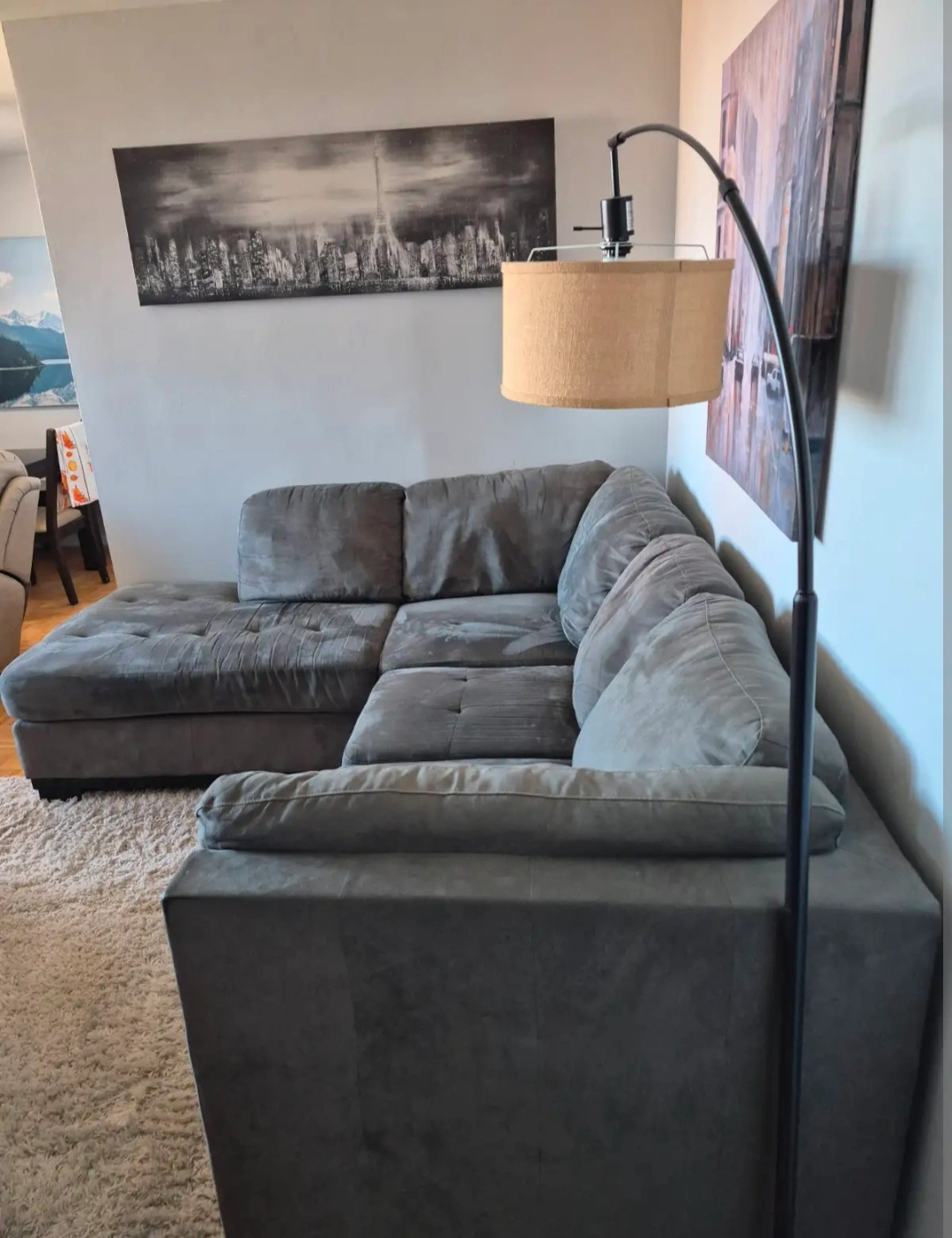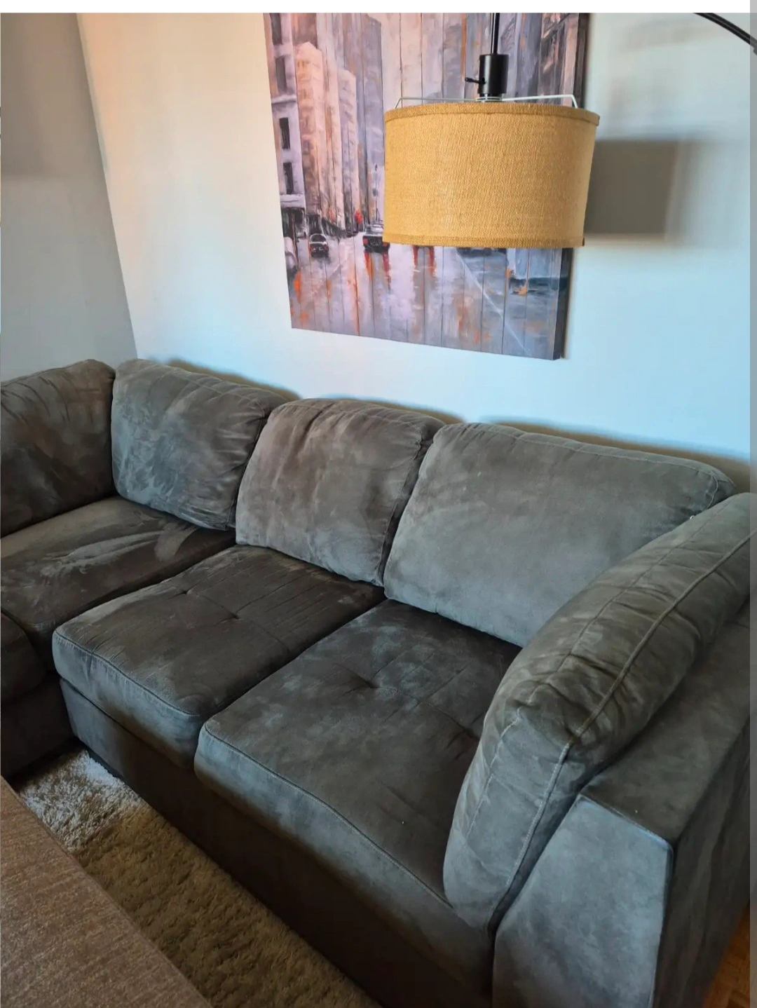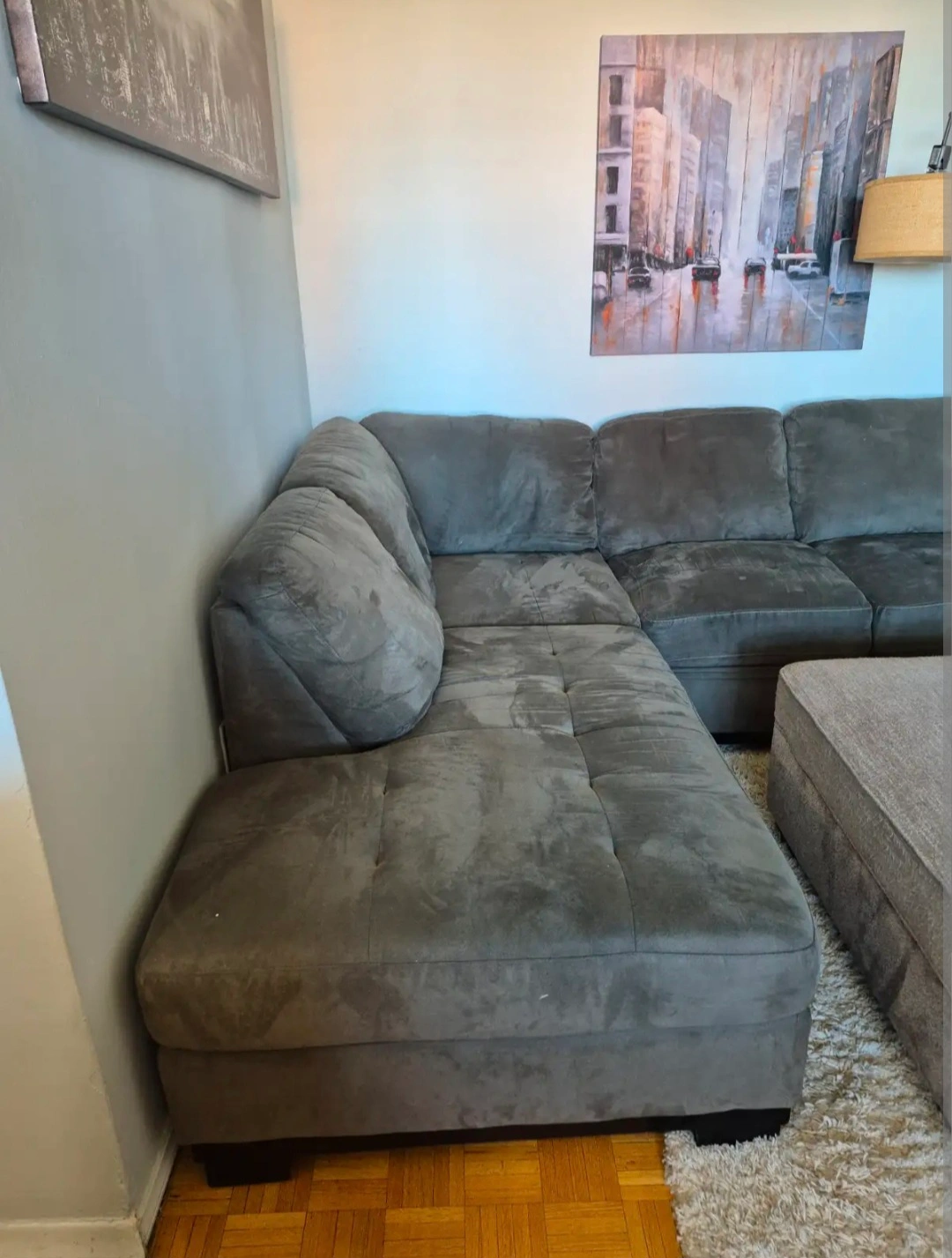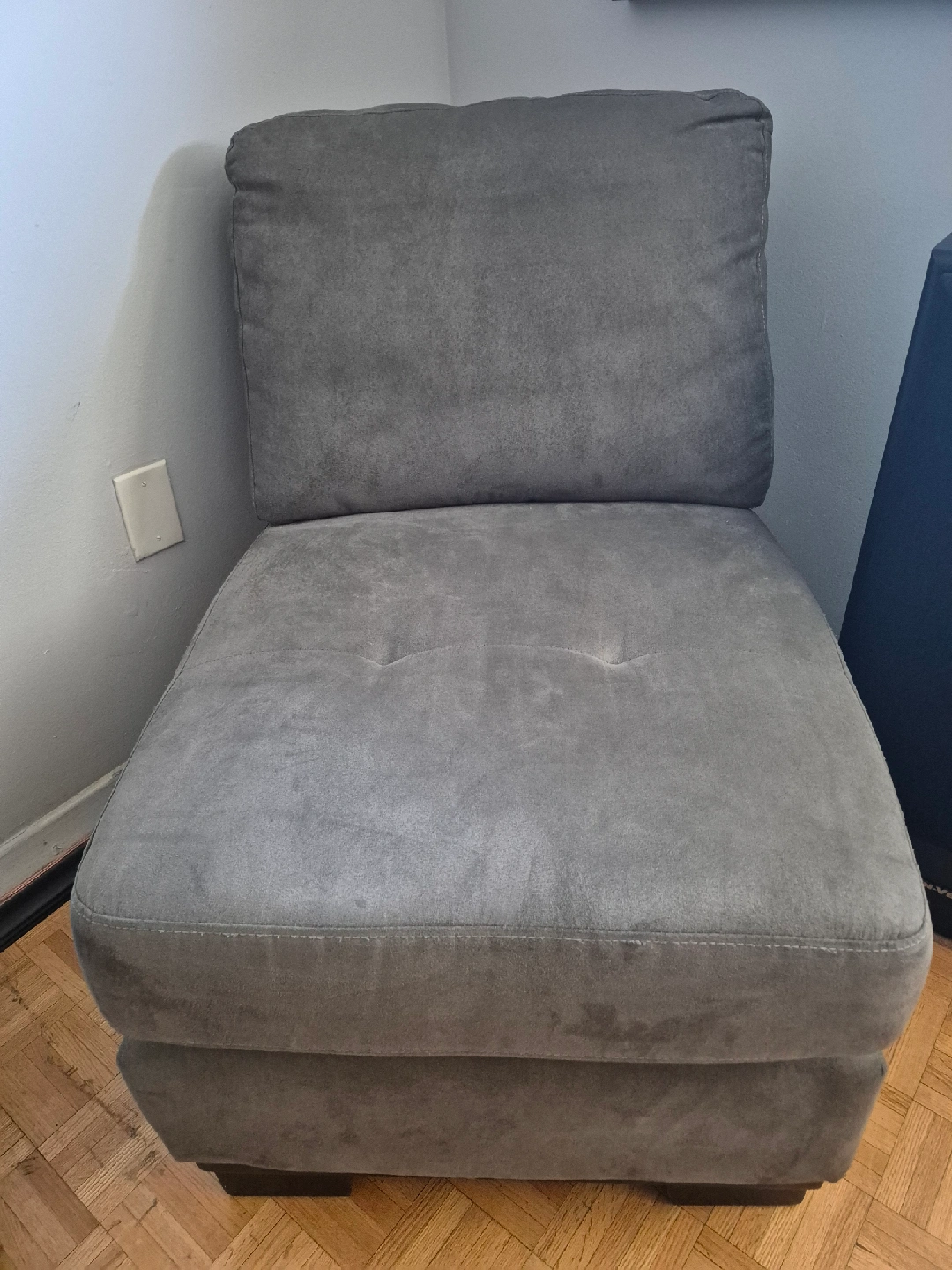 Selling a comfortable grey sectional sofa & chair It's in good condition none smoking appartment no pets no children just 2 adults would be a great addition to any living room. Perfect for lounging and entertaining!asking 550$ or best offer thx for looking measurements are (1) sectional is 38x99 the other is 38x84 and the chair is 24x38 please arrange pick up truck ahead of time thx