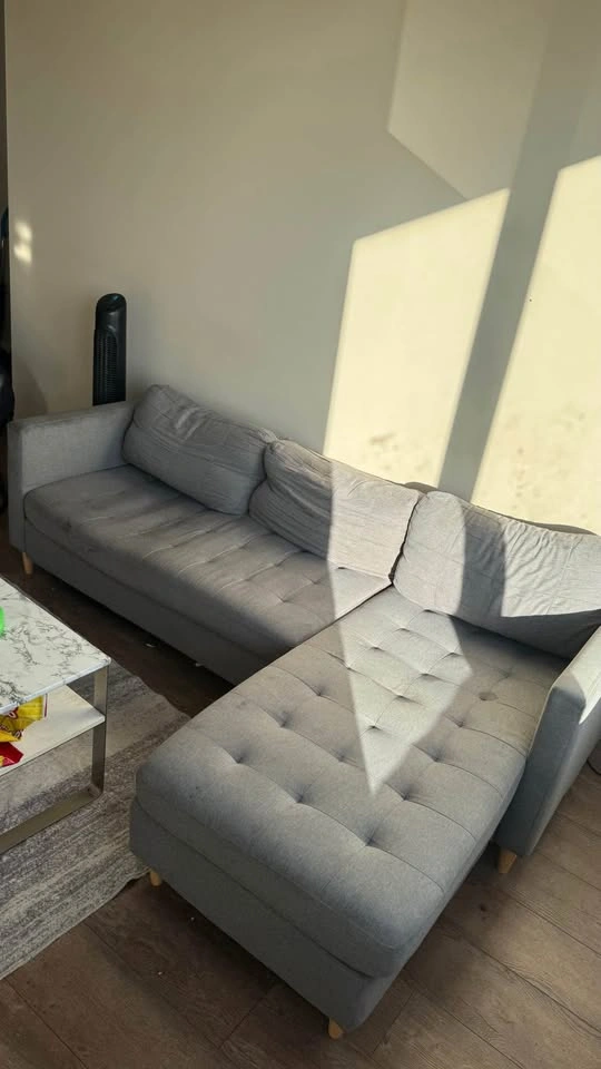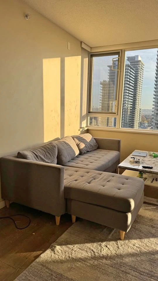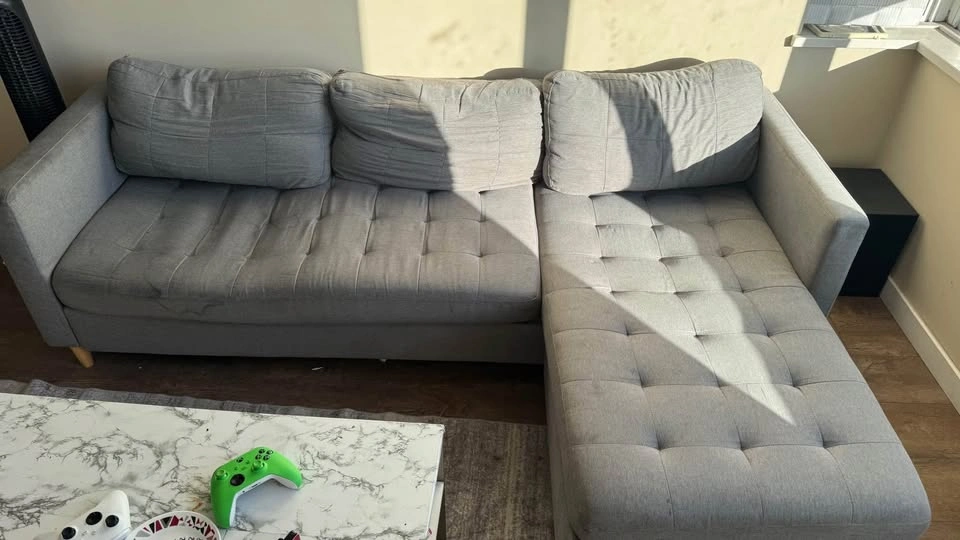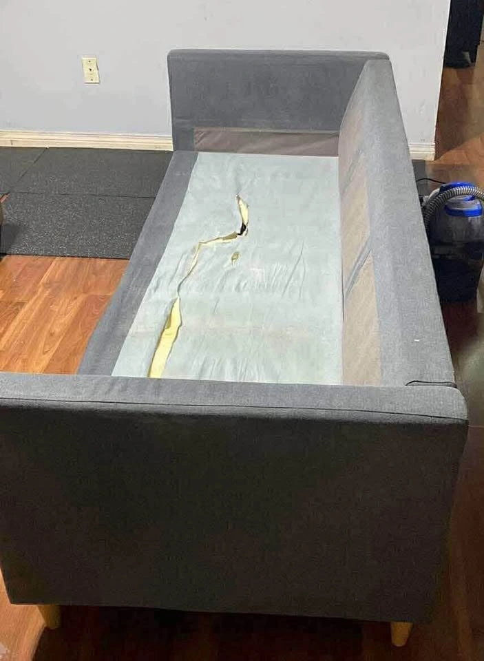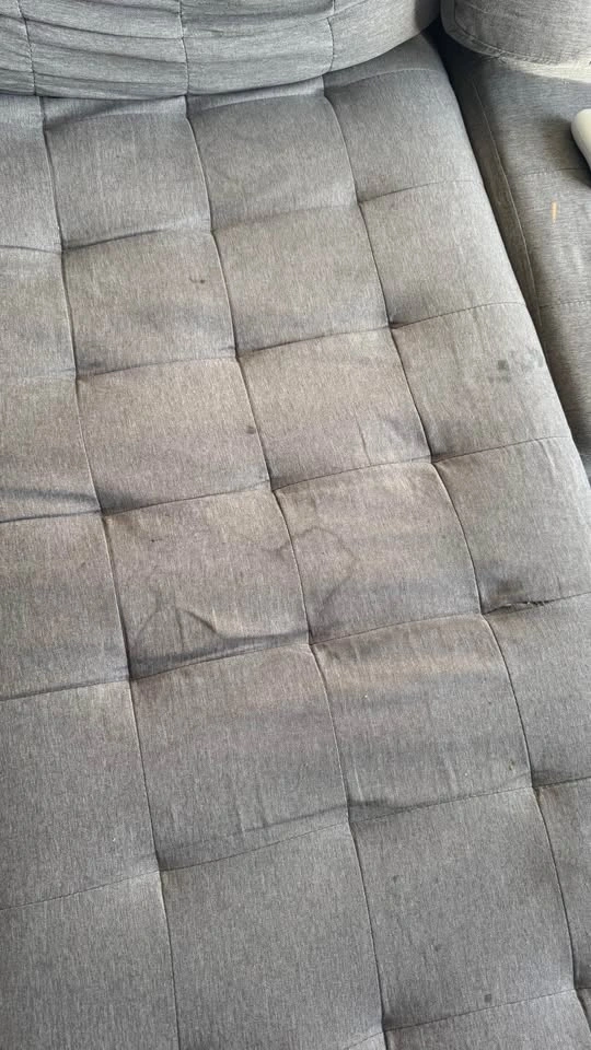 60There is only an ottoman piece and the seating part is one long piece and the sides are interchangeable to be on the right or left. The tears don’t matter,they will be hidden and works completely perfect. A few stains as shown in the picture