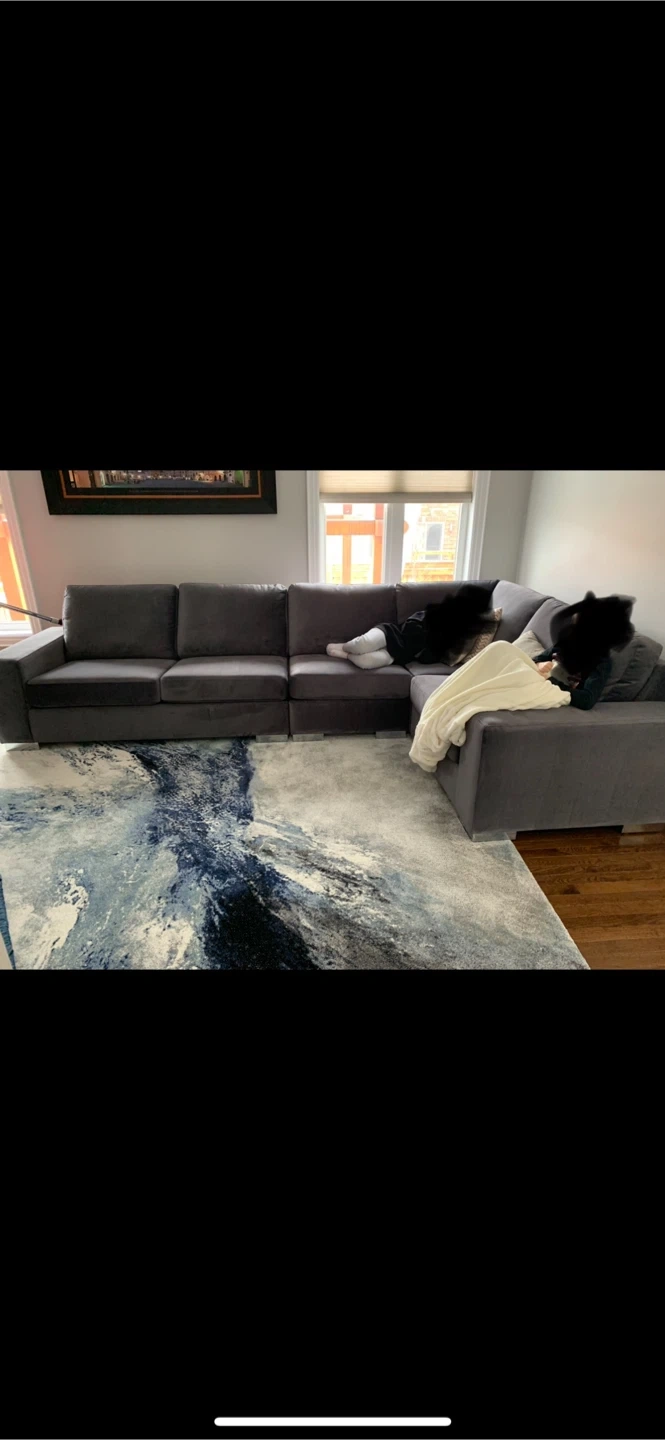 Selling a comfy grey sectional sofa. It's in great condition and would be perfect for a living room or basement. The material is soft and the sectional design allows for flexible arrangements. Ready for a new home!