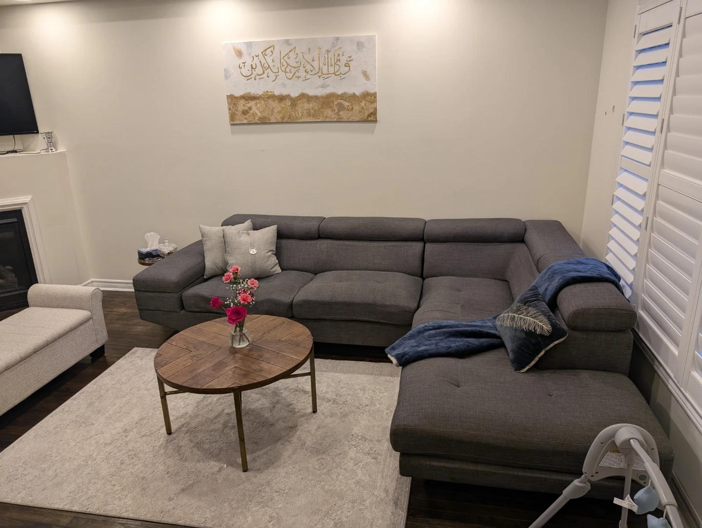 10Selling a comfortable grey sectional sofa. It's in a ok condition and perfect for a living room or family room. It offering a relaxing spot to stretch out. The neutral grey colour will complement any decor style. As is. Changing my decor. Perfect for upholstery businesses or private seller