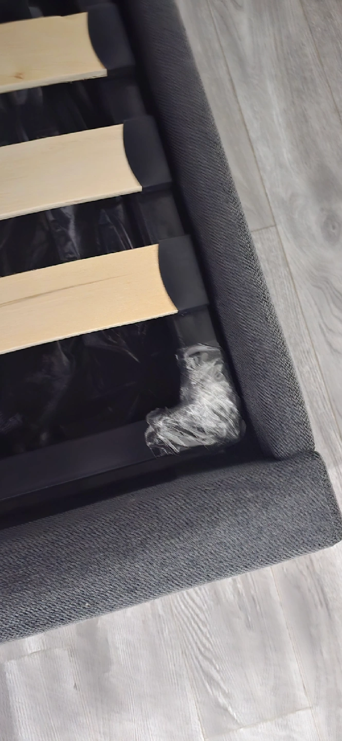 The package includes a grey upholstered bed frame with under-mattress storage, which seems to be in good condition, although there is a minor cosmetic imperfection on the right corner. Furthermore, a sectional sofa and a coffee table are also included.