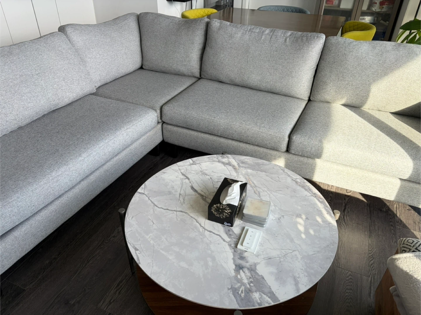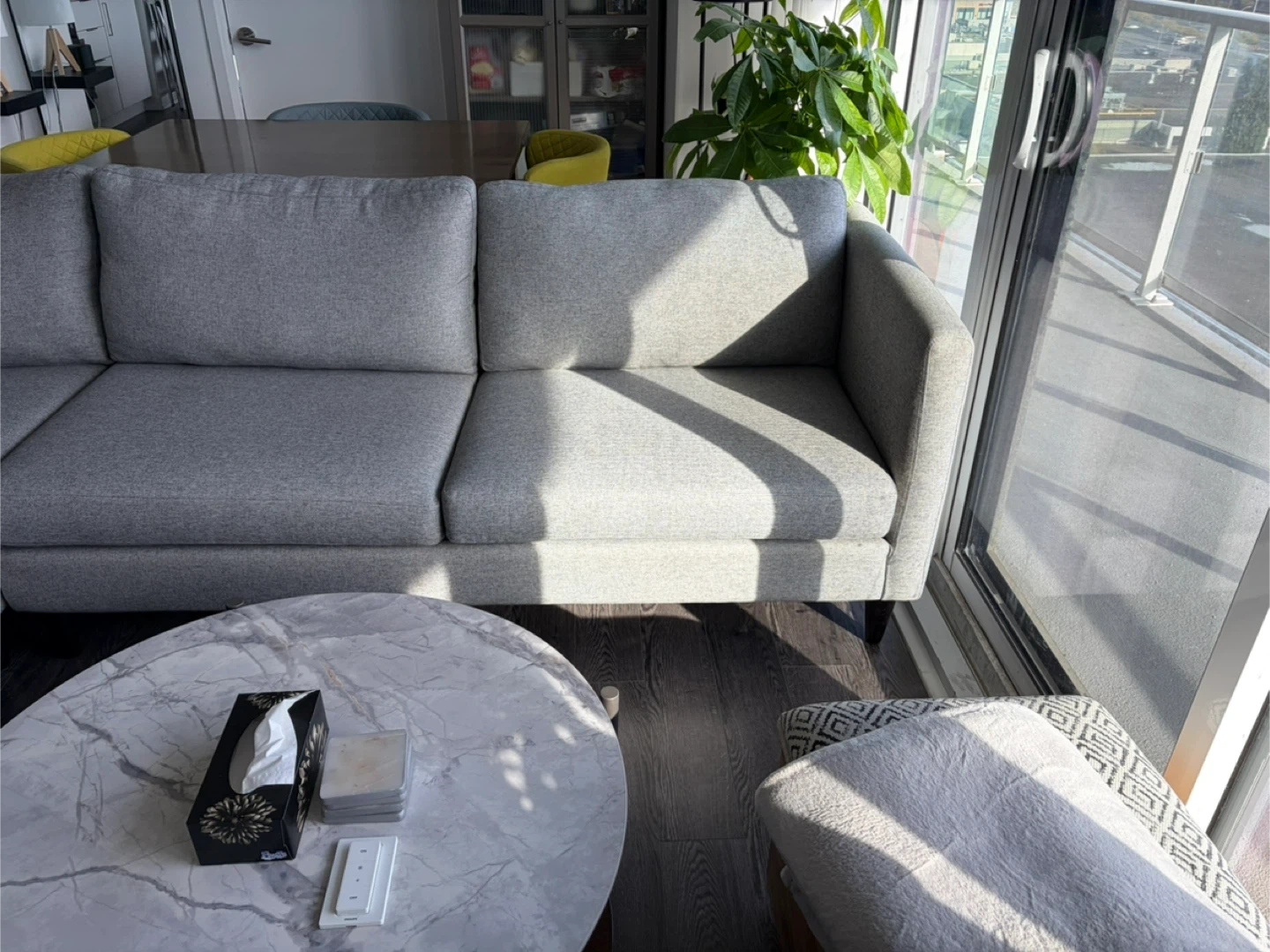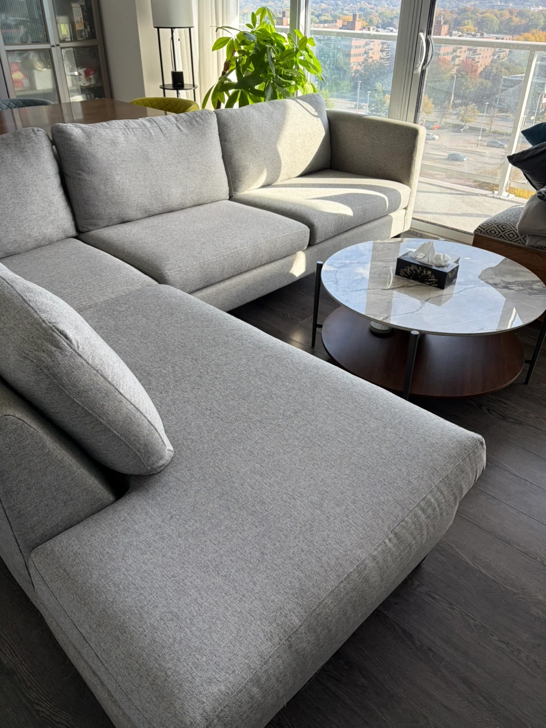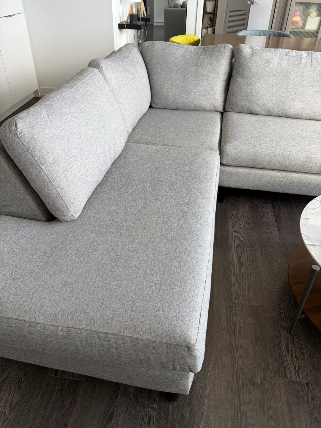 12Selling a cozy grey sectional sofa! It's in great shape and would be perfect for a living room or den. It's a comfortable spot to relax and enjoy your space. Comes with washable covers. Sits a few inches off the ground. Minor wear from normal use. https://www.mydesignrepublic.com/collections/all-sofas/products/patti-2-piece-apartment-sectional-sofa Comes with a lifetime warranty on the frame. Please see dimensions below. 89"W X 36"/91"D x 34"H Seat Depth: 22" Seat Height: 18" Arm Height: 29" Pick up only. Located in North York near Don Mills and Lawrence. Thank you