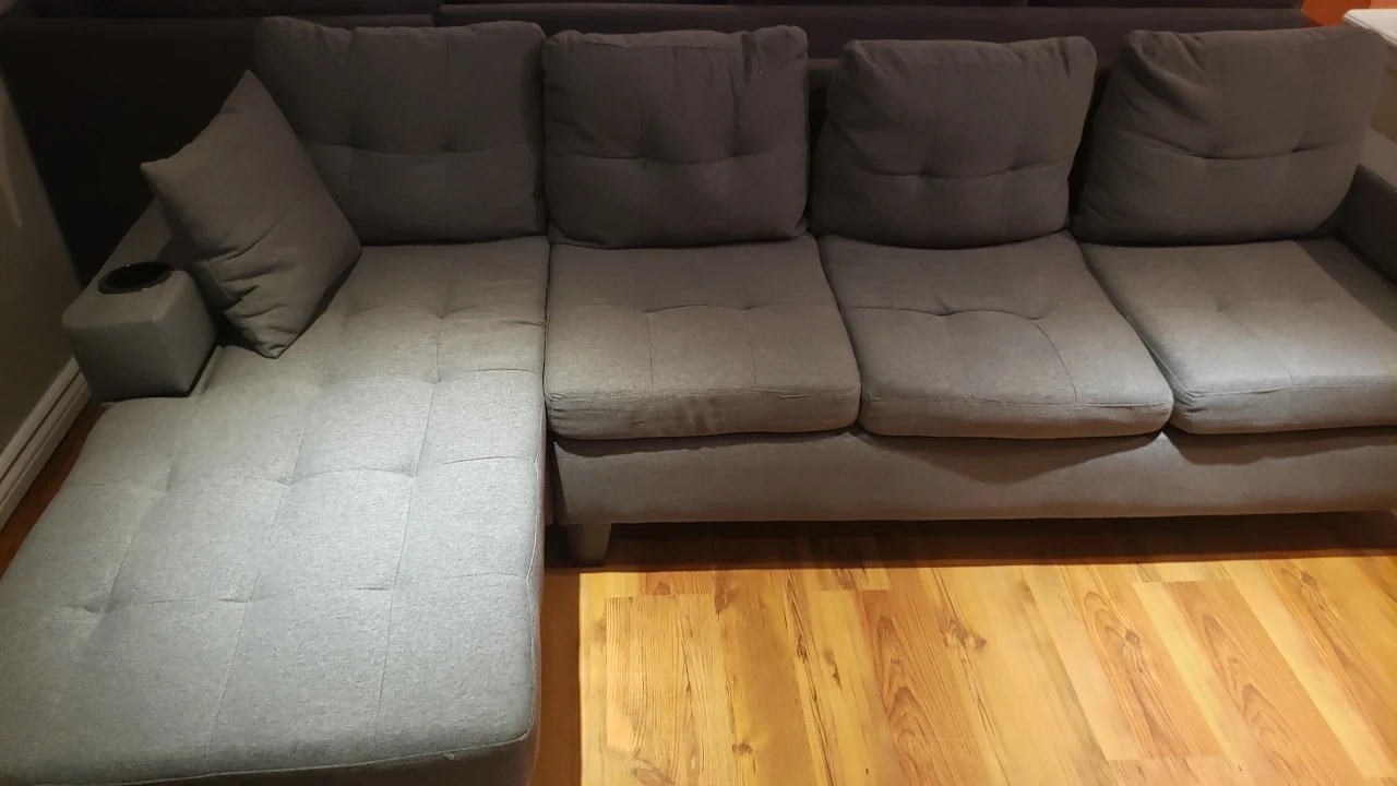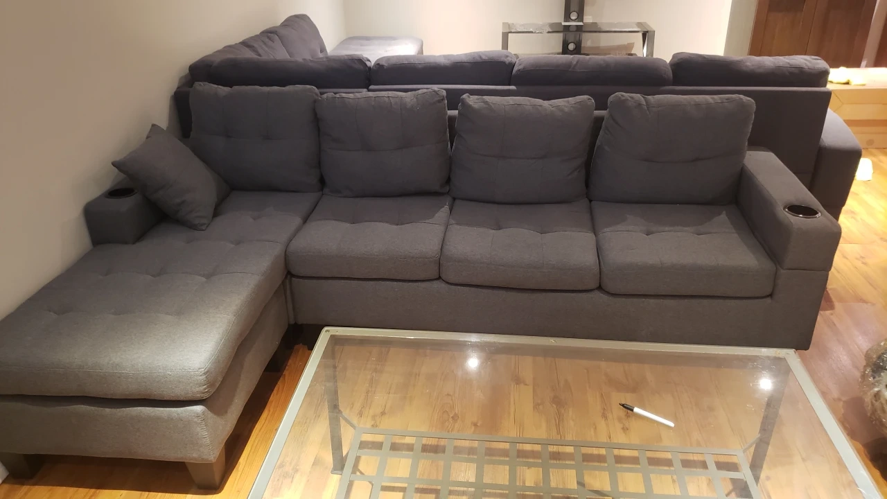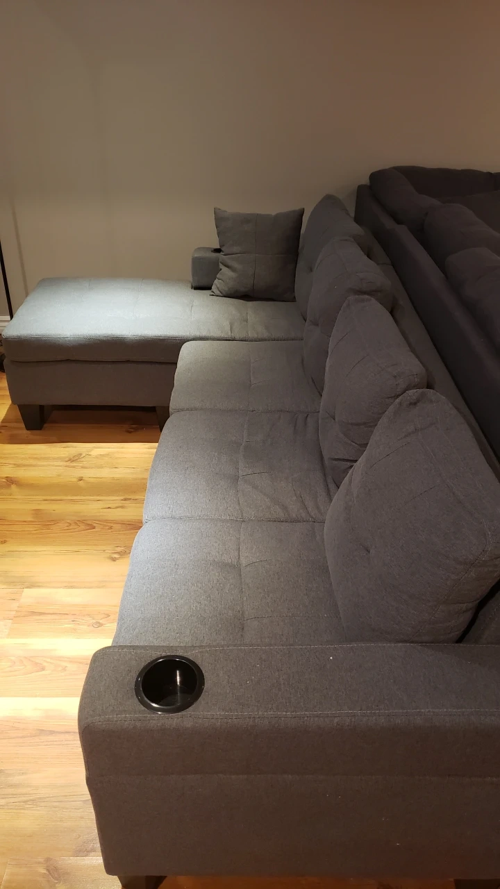 Selling a comfortable grey sectional sofa. It features a chaise lounge for extra relaxation and convenient cup holders on the armrests. Perfect for a living room or entertainment space!