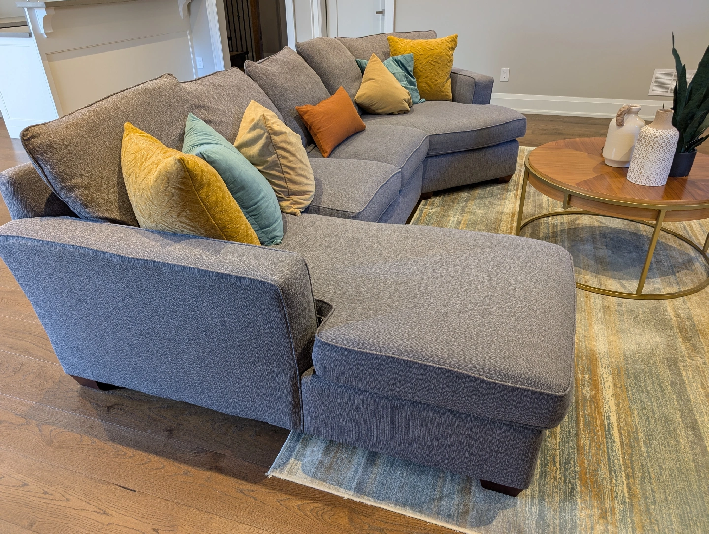 Selling a comfy grey sectional sofa! It features a chaise lounge on one side and cuddler on the otherwise - perfect for relaxing. This sectional is in great condition and would be a wonderful addition to any living room. Throw pillows are not included. Originally purchased from the Bay. Coxwell and O'Connor