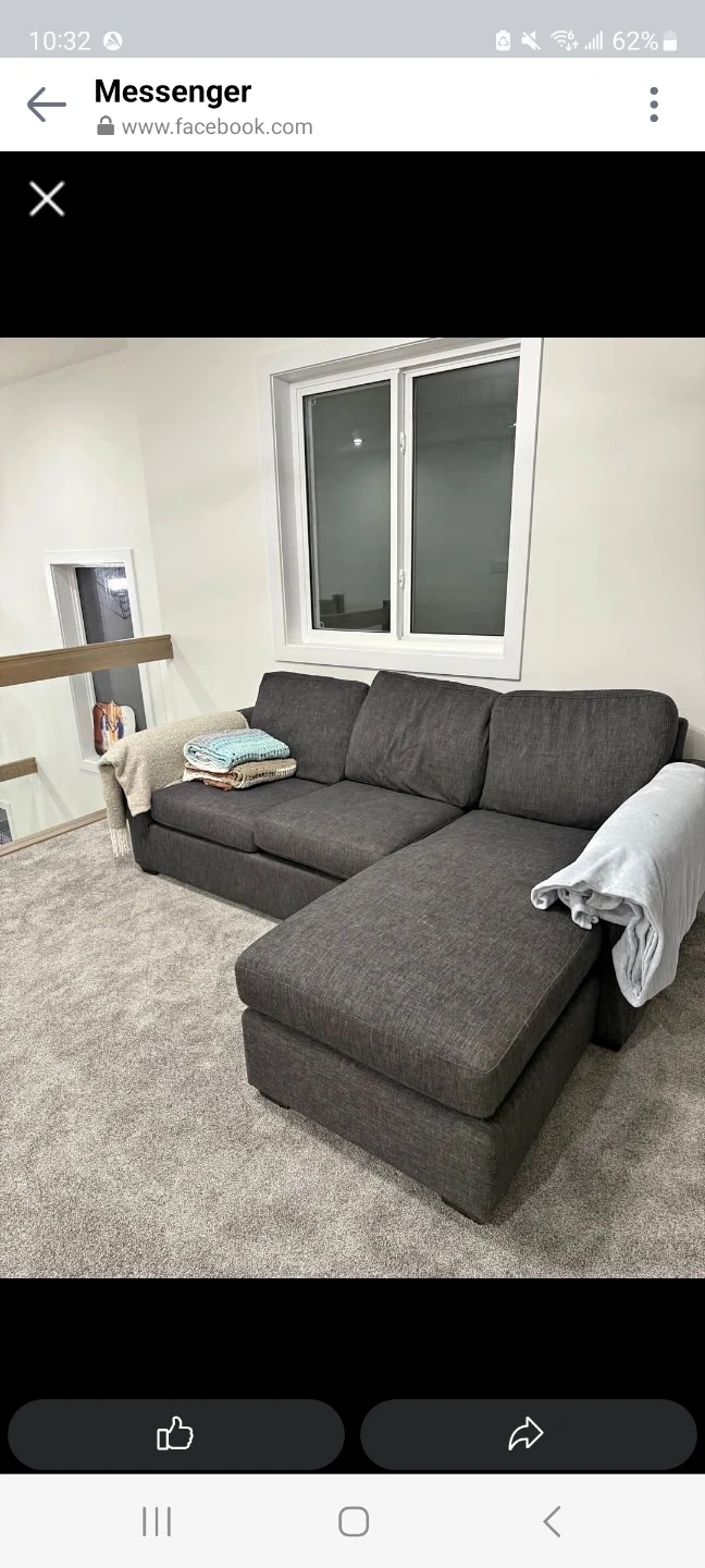 87Selling a comfy grey sectional sofa! It features a chaise lounge, perfect for relaxing. It's in great condition and ready for a new home
