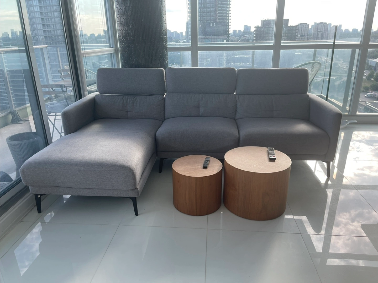 65Selling a comfy grey sectional sofa with a chaise lounge! It's in great condition and would be perfect for a living room or den. The chaise is super comfy for lounging and the couch is a great size for entertaining or relaxing. It has a modern look with black metal legs. Feel free to reach out if you have any questions! More than 50% off retail. 1000 retail. Pick up only from condo in Bayview Village.