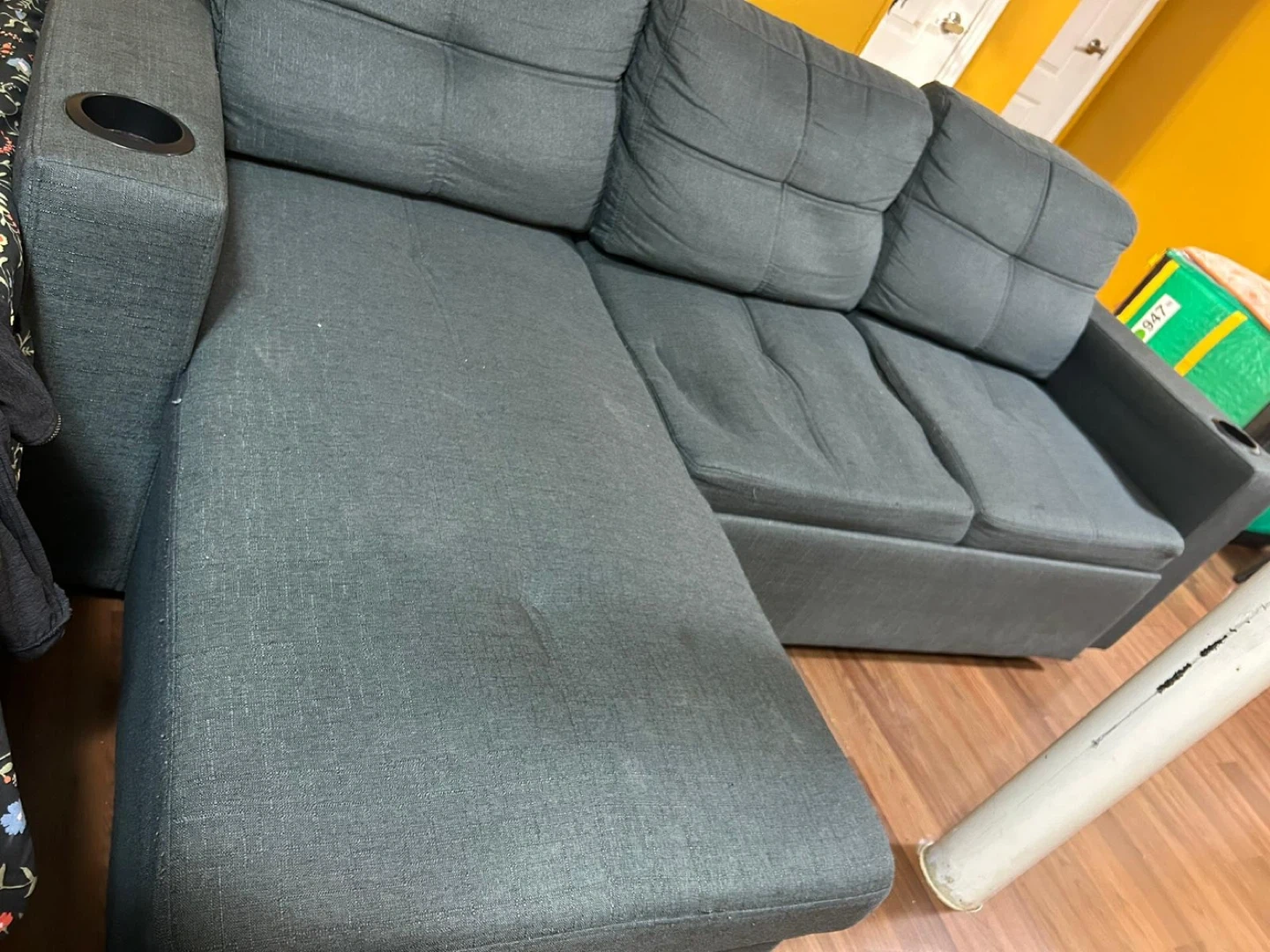 10Selling a comfy grey sectional sofa! It features a chaise lounge and built-in cup holders for your convenience. Great for relaxing and watching movies