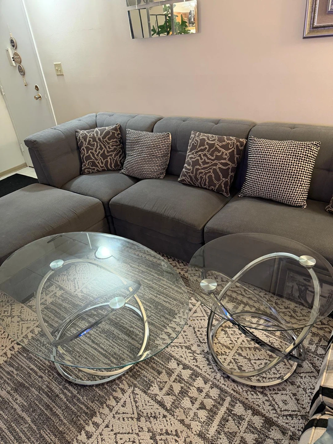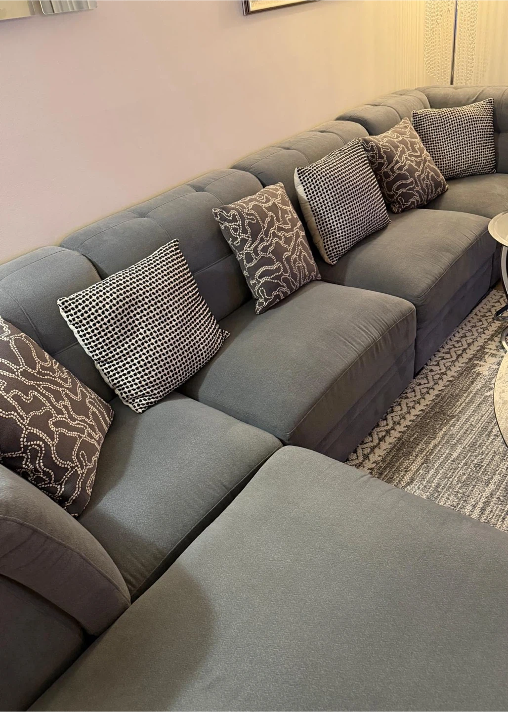 10Selling a comfy grey sectional sofa. It's in great condition and would be perfect for a living room or family room. The cushions are soft and the fabric is durable. It's a great piece to relax on!