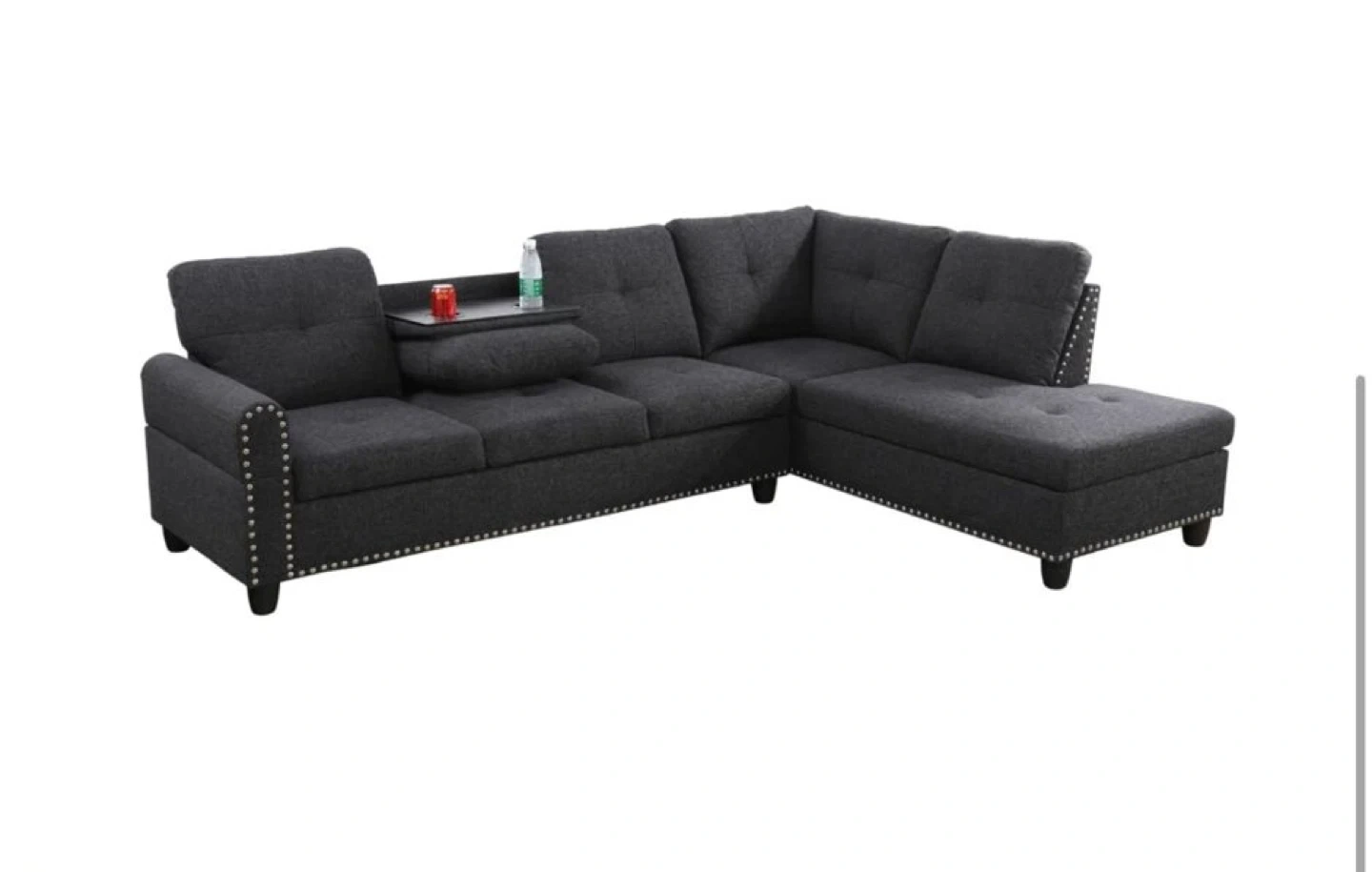 60Selling a sectional sofa in grey! It comes with a left arm sofa and a right arm chaise. The sofa features a convenient pull-down console with cup holders, perfect for movie nights or relaxing with a drink. Got two sofa delivered and they told me to keep the extra.
