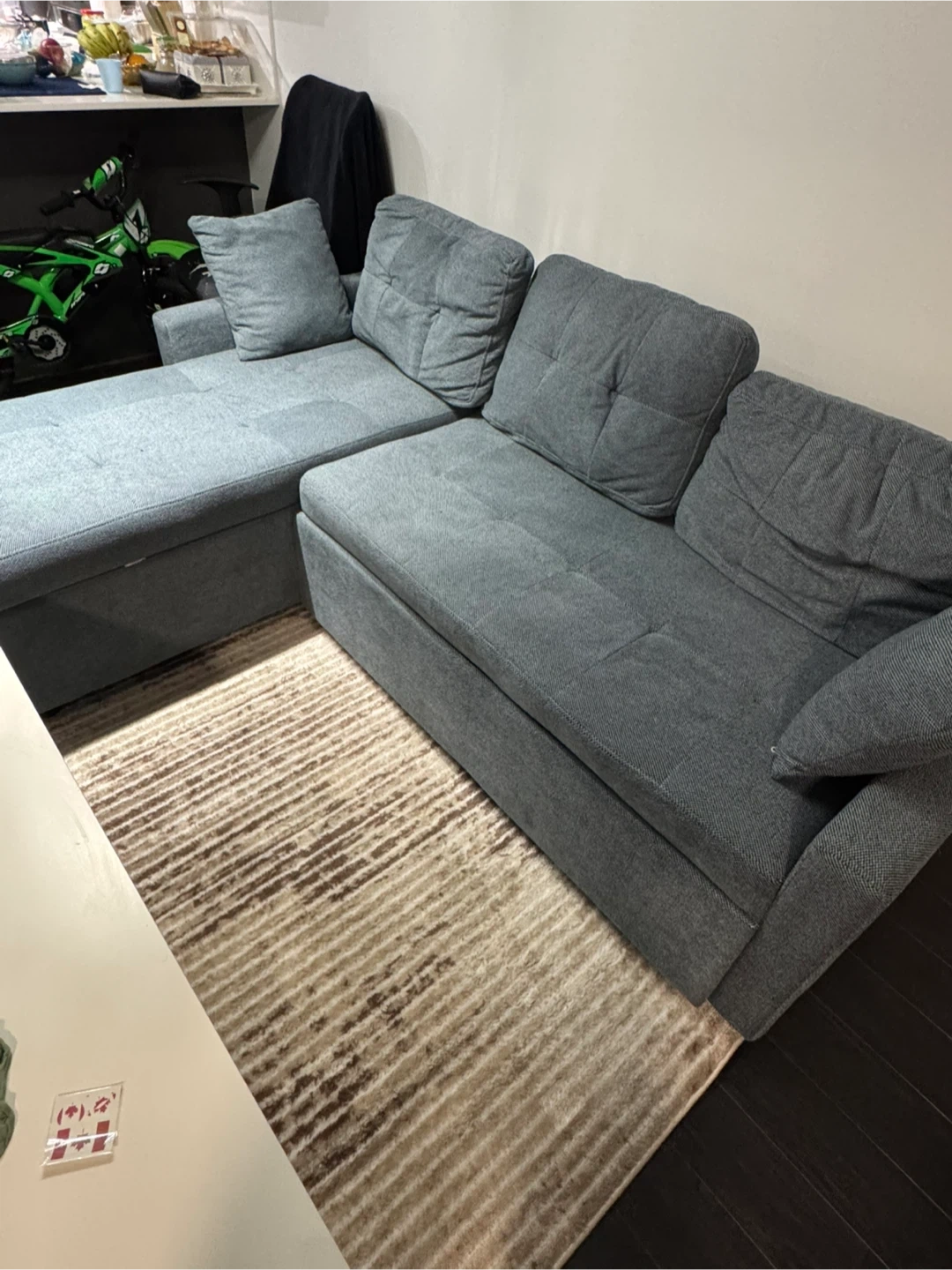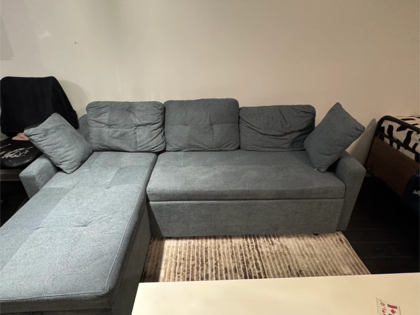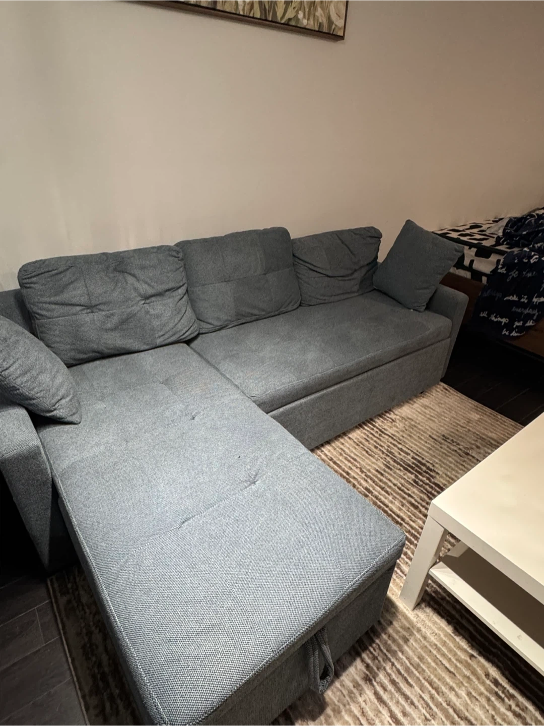 10Selling a comfy grey sectional sofa! It's in good condition and has handy storage space under the chaise lounge. Perfect for a living room or family room setup. It's a great piece to relax on after a long day!