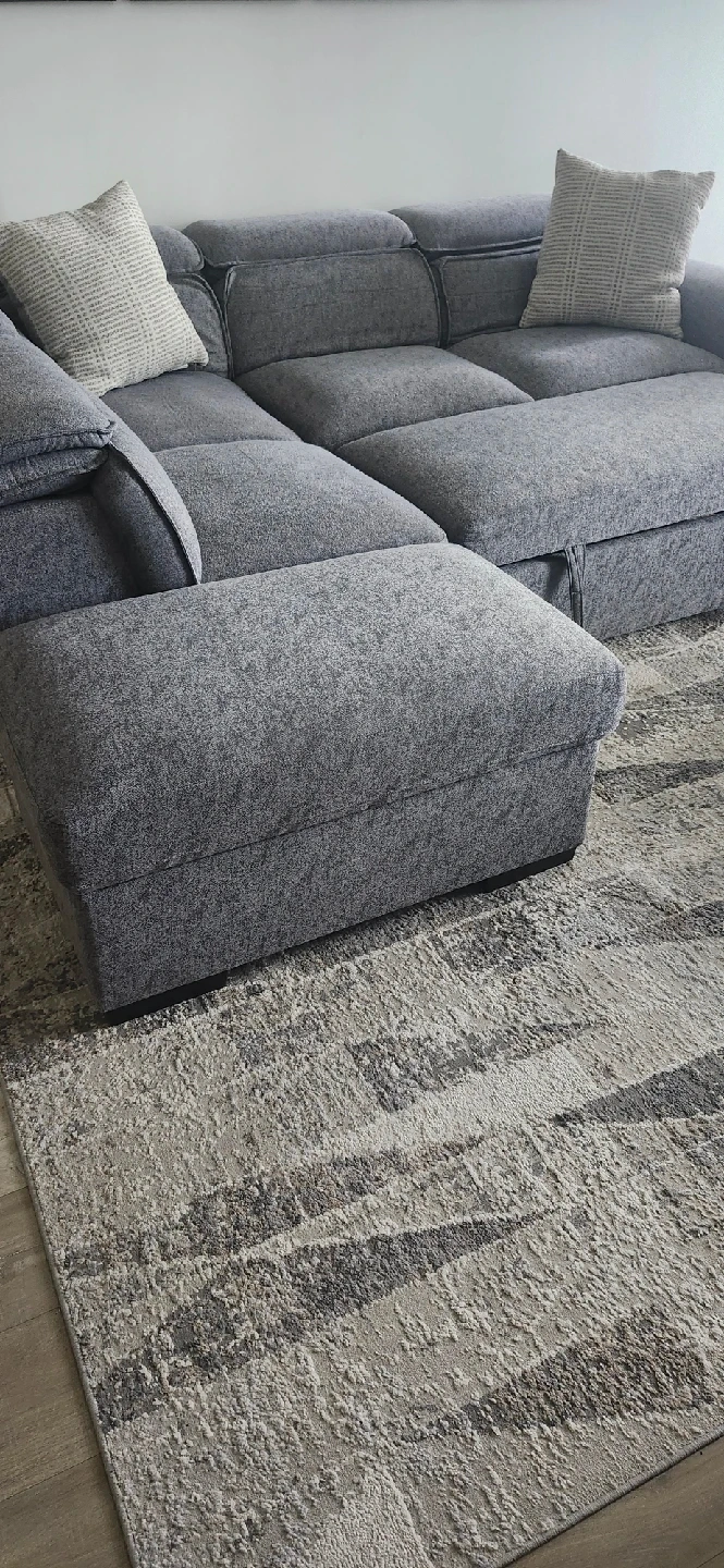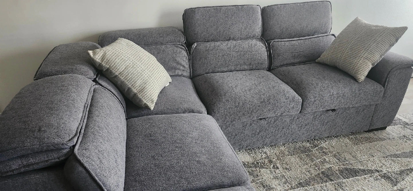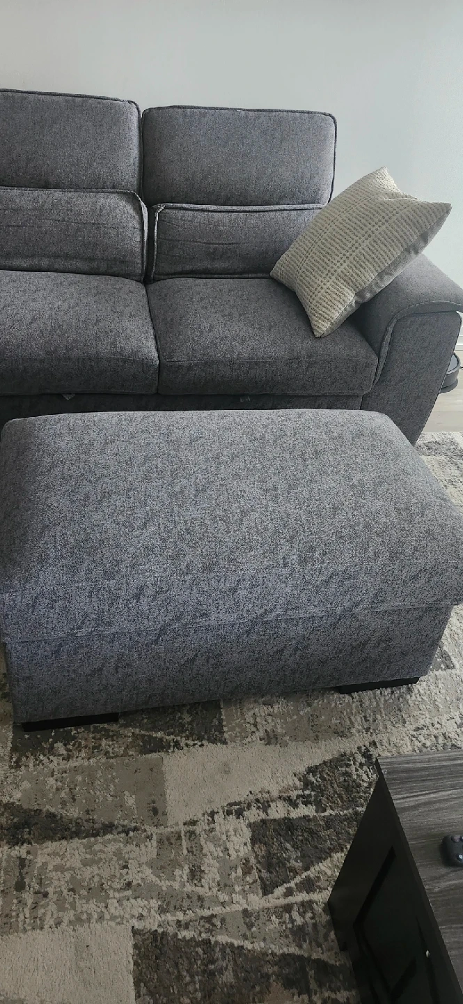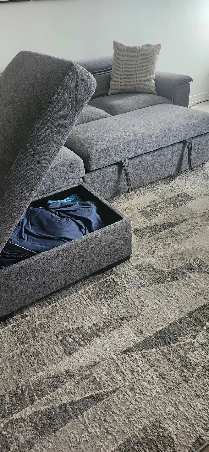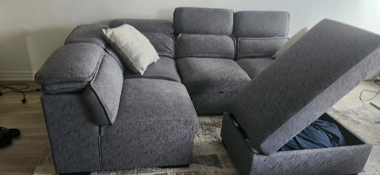 10Selling a comfortable grey sectional sofa. It features a storage ottoman, perfect for keeping blankets or other items tucked away. Purchased last year, still in excellent conditions. Features: Adjustable headrests Intrgreated pull out sofa bed (super comfy) Ottoman with ample storage Couch Measurement: L: 101 inch W: 65 inch Ottoman Measurement: L: 3.4ft W: 2ft Free Delivery (on selected days) possible if you leave around Etobicoke or Missisauga- depends on distance. Can be discussed.