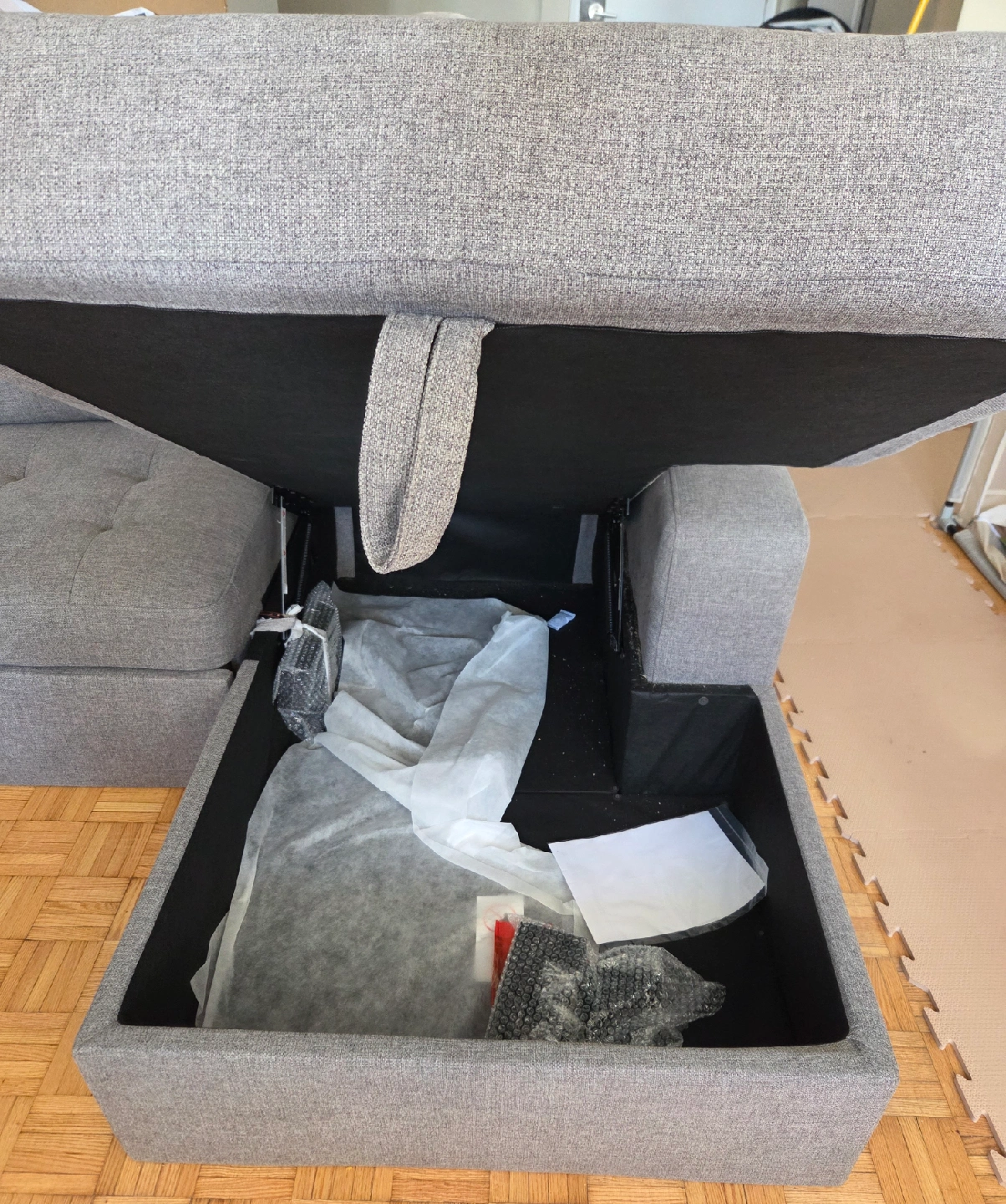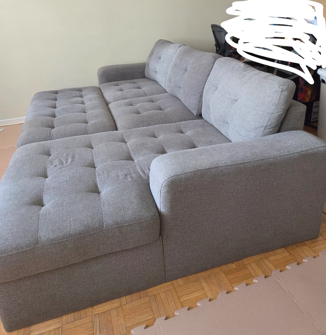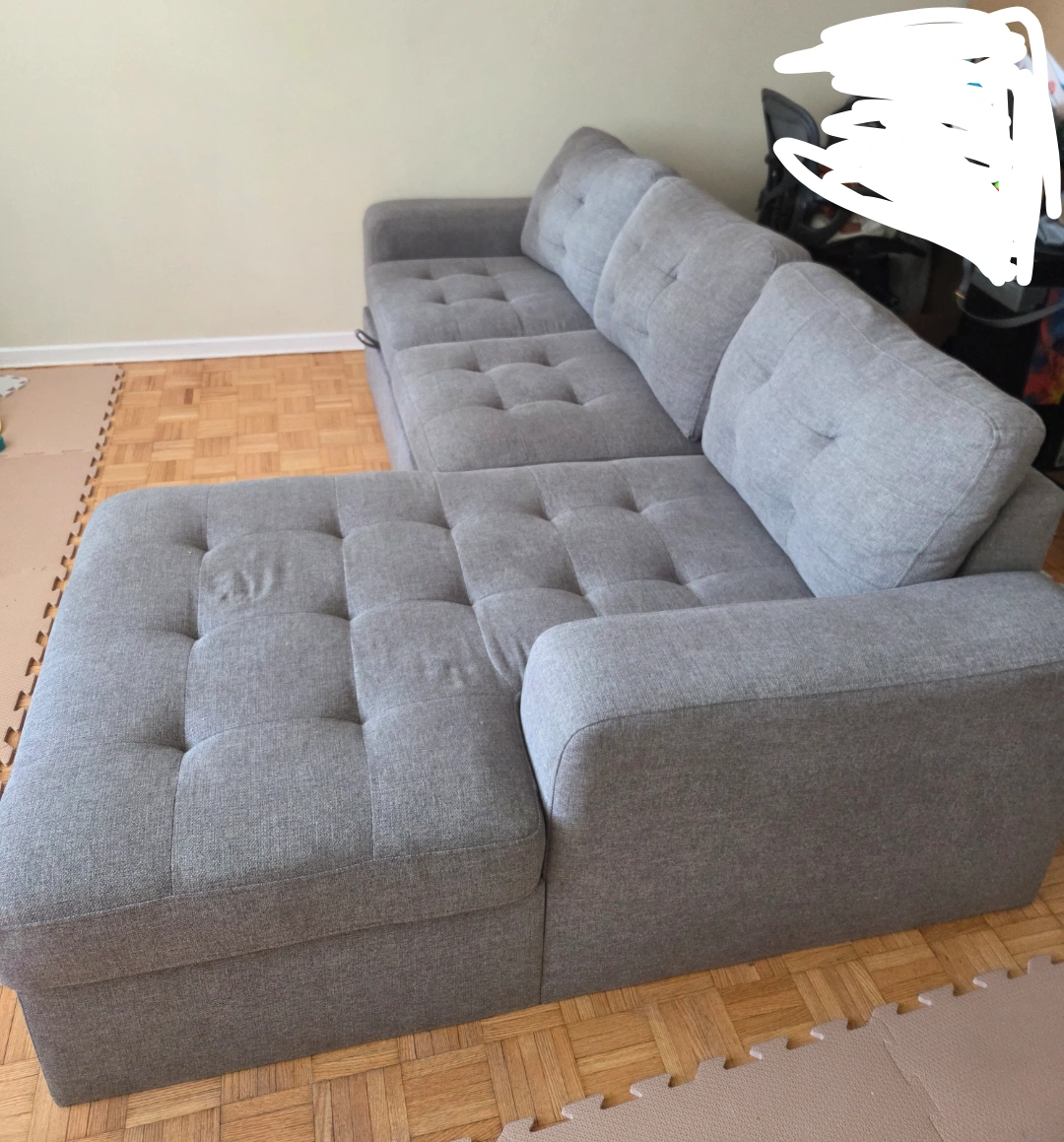 15Selling a comfy grey sectional sof with pull out bed.. Used for obly 10 months. It's in great shape and features a handy storage compartment built right in. Perfect for keeping blankets, pillows, or anything else you want to keep tucked away but easily accessible! The sectional design makes it ideal for lounging and relaxing in your living room or den