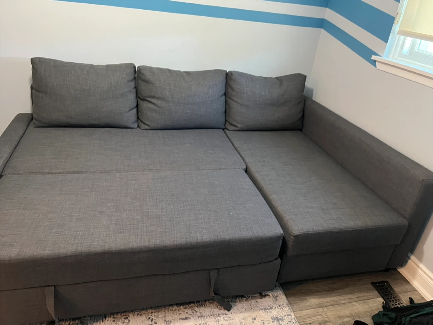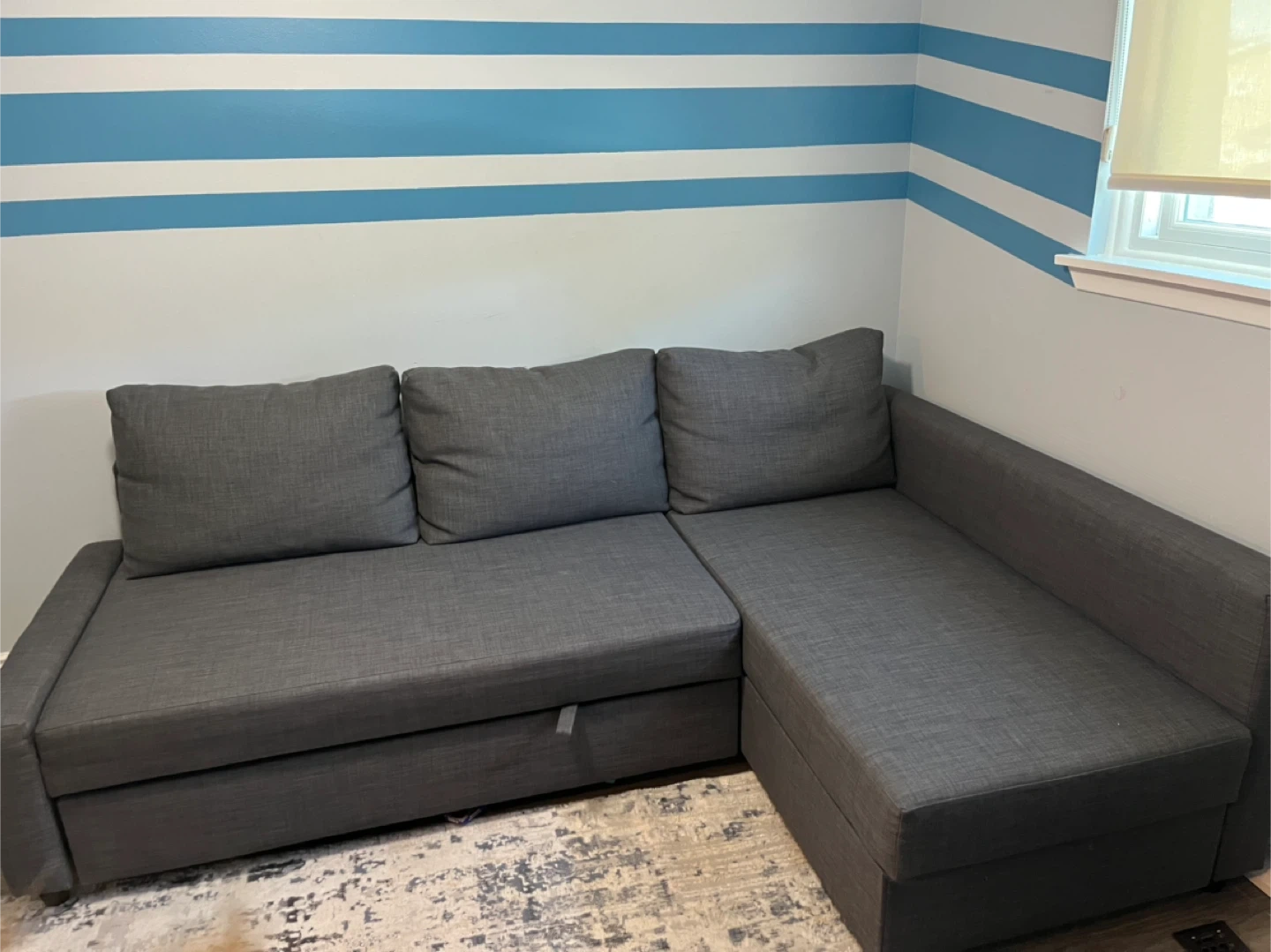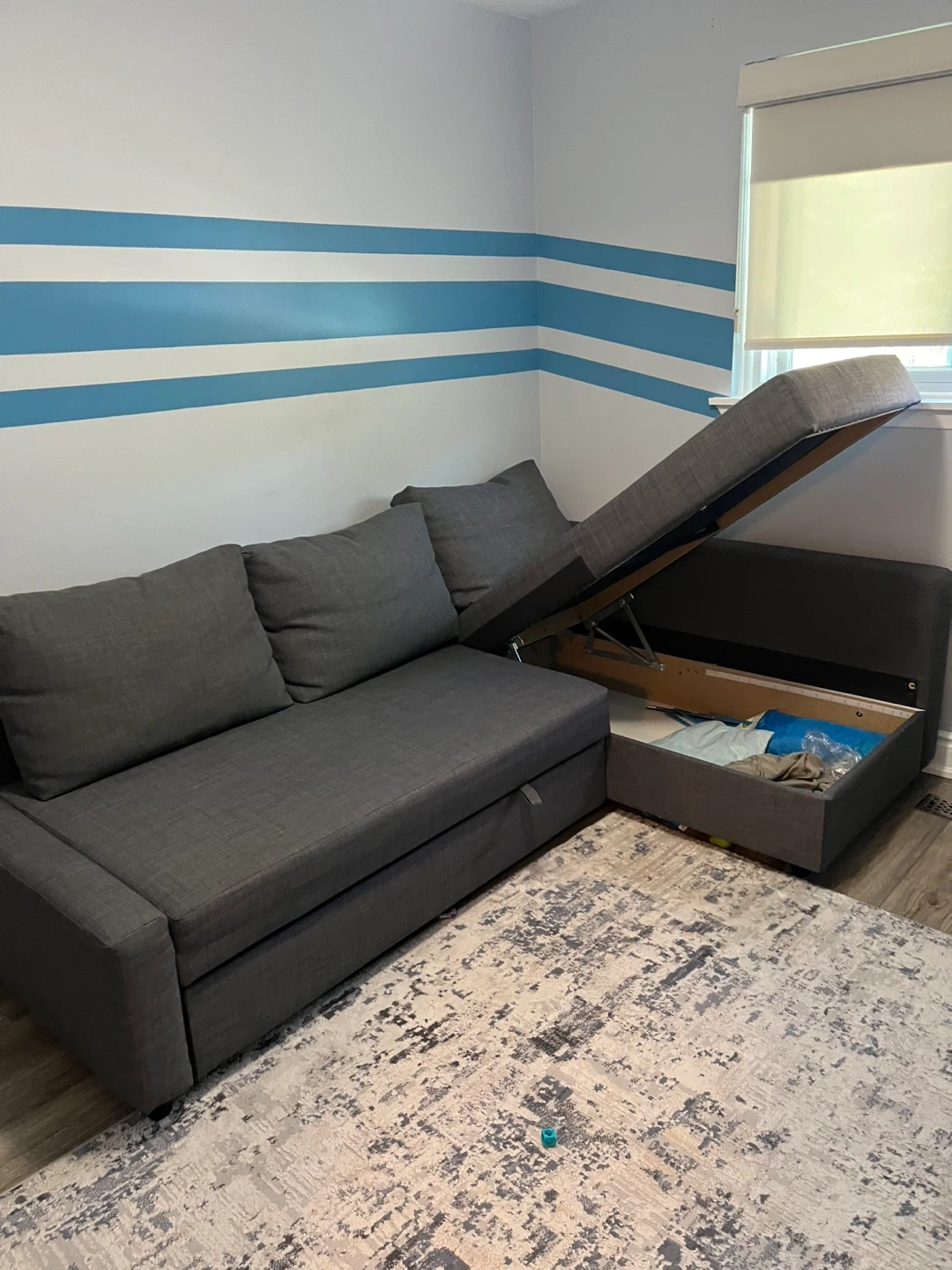 Selling a grey sectional sofa with built-in storage! It's in good condition and perfect for a living room or basement. The sectional provides ample seating and the storage is great for blankets and pillows. It has some wear and tear in the storage area. Measurements are 81”x58”