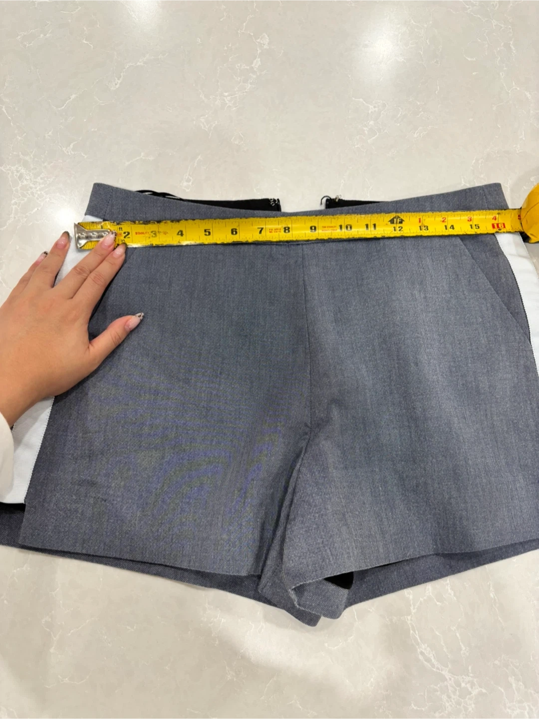 597Selling a pair of grey shorts, size 8. They have a white stripe on the side. Perfect for a casual or dressy look!