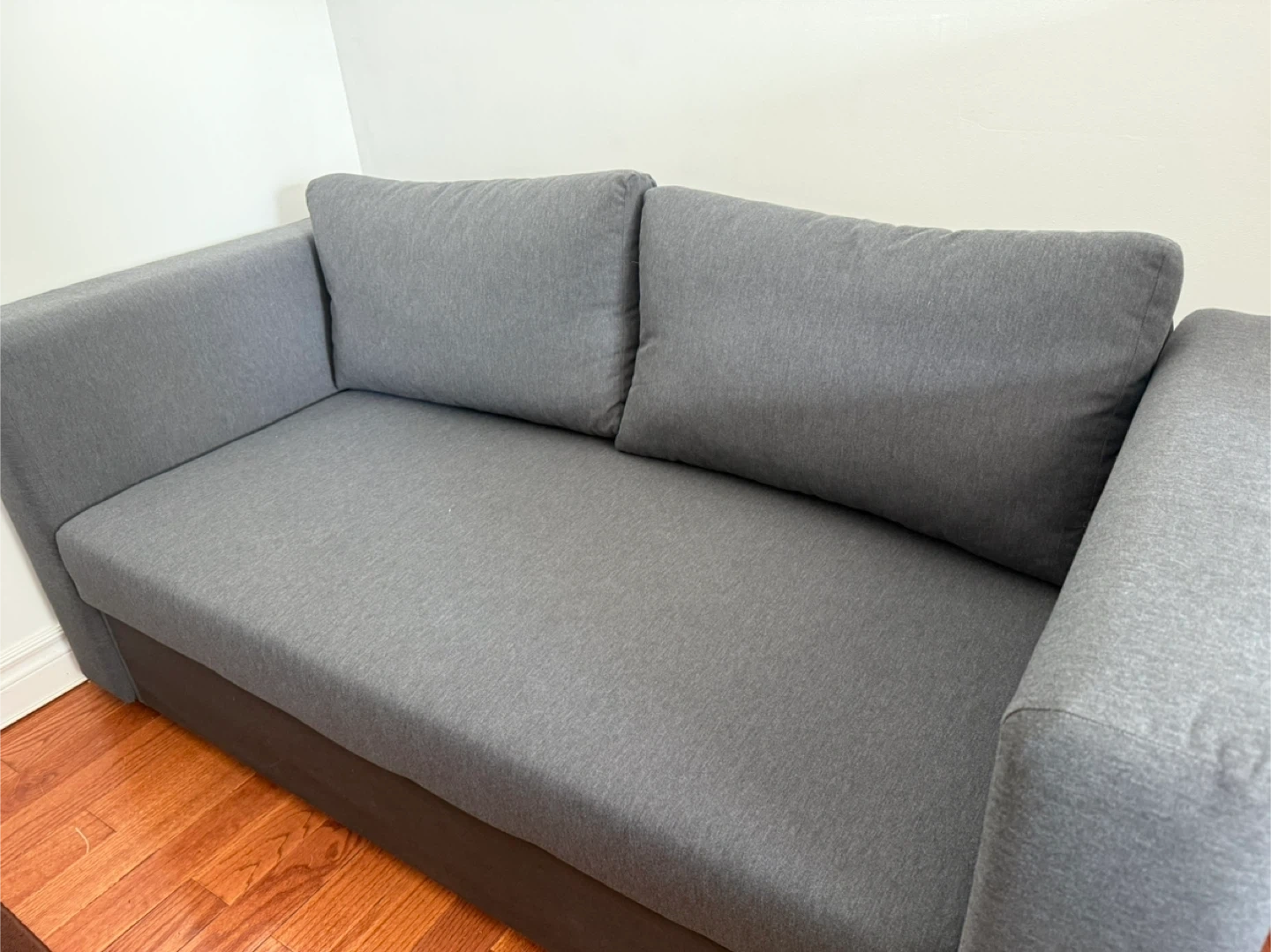 Selling a comfy grey sofa bed, perfect for guests or small spaces! It extends out, so you can kick your feet up and relax or have a good night’s sleep. There is also storage for extra pillows. The condition is great, and it's ready for a new home!
