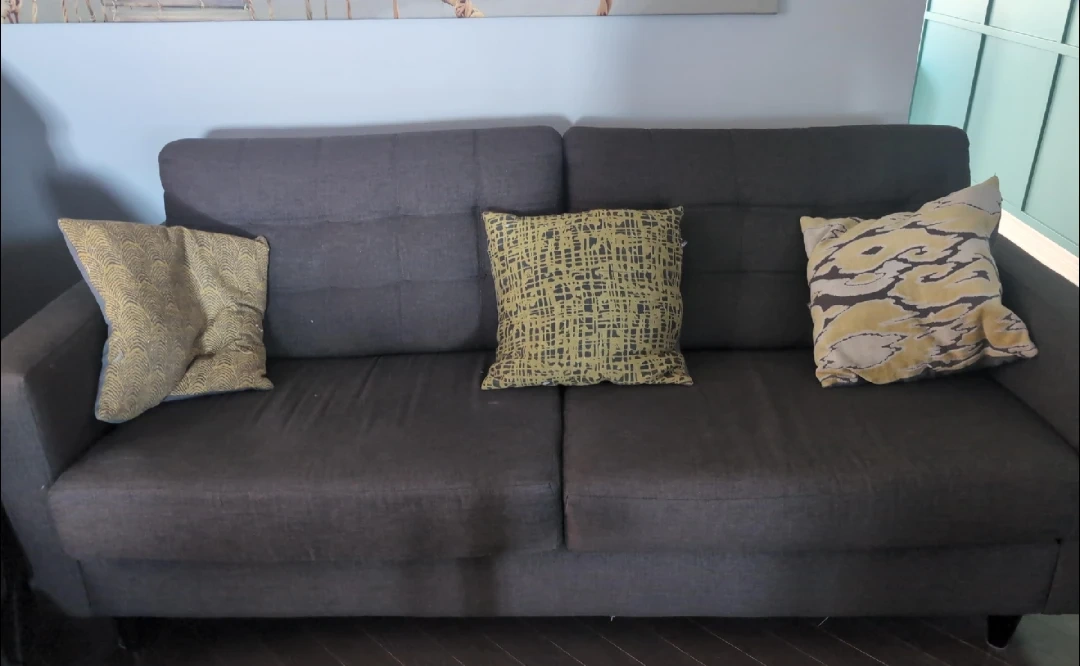 10Selling a comfy grey sofa, perfect for a living room or den! It comes with three cushions in various patterns and colours. The sofa is in good condition and ready for a new home