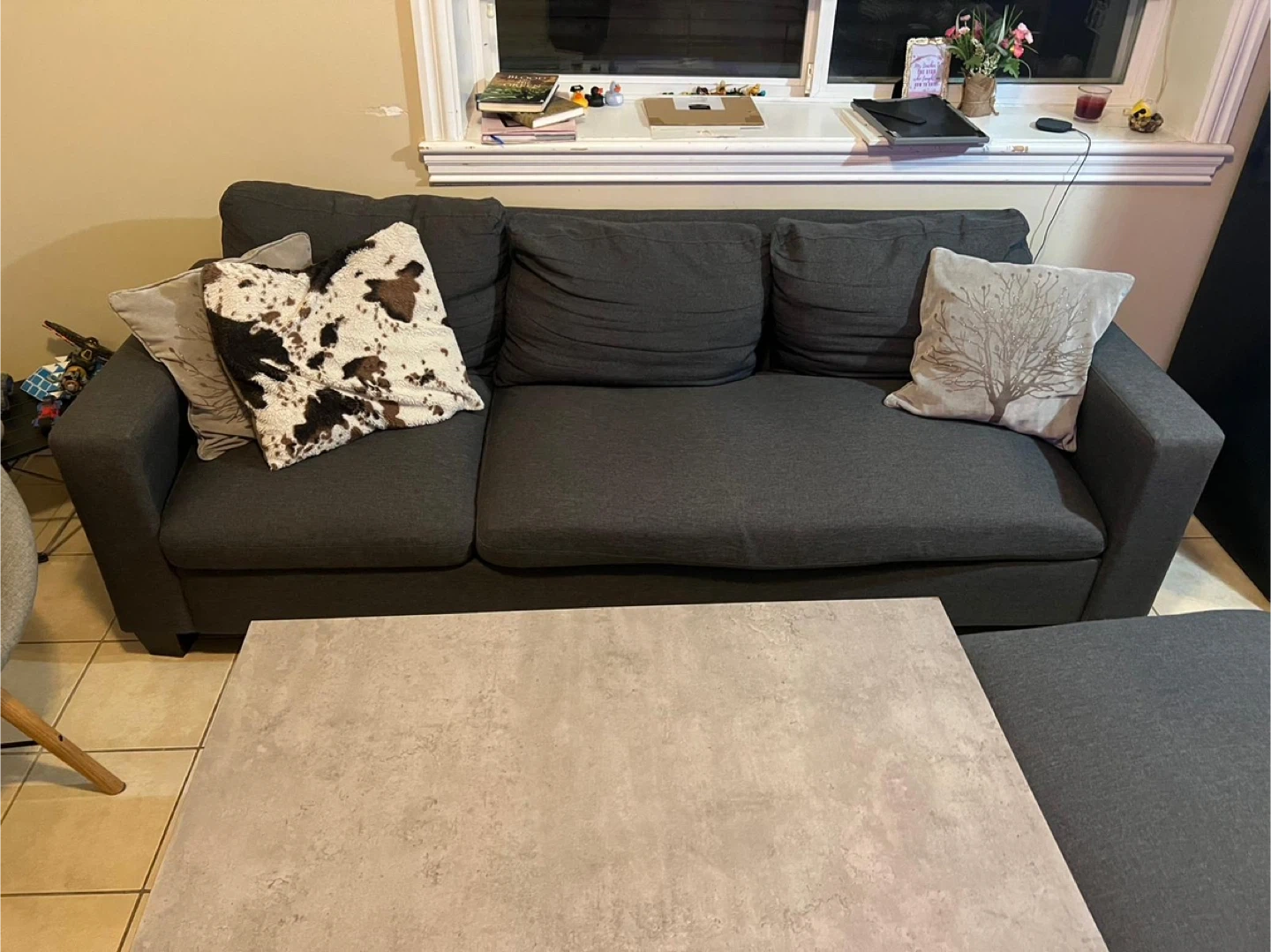 Selling a comfortable grey sofa with a matching ottoman. It's in great shape and perfect for a living room or den. The ottoman can be used as extra seating or just to kick your feet up after a long day. It's a great set!