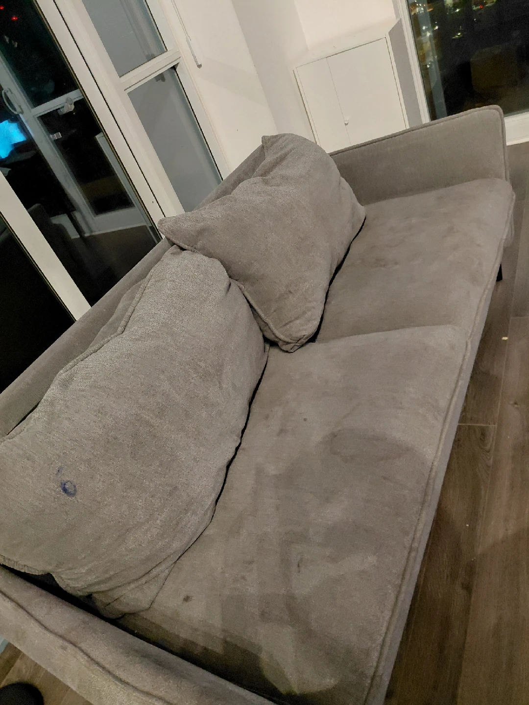 10Selling a comfy grey sofa that comes with matching pillows. It's perfect for a living room or den. There are some signs of use, as pictured.