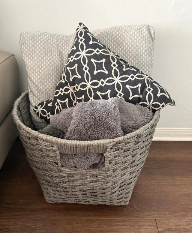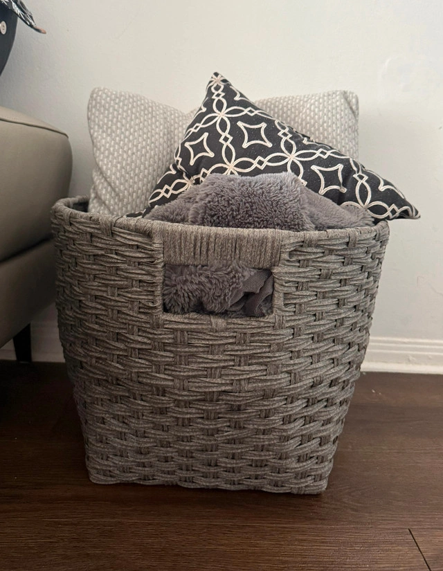 10Large grey wicker basket, chic and practical. Perfect for storing blankets, toys, laundry, or anything you want to keep tidy. Sturdy build with a modern neutral look that fits any room. Generous size and holds a lot. Comes from a pet-free and smoke-free household. Pick-up in Mississauga. This is part of a moving sale - I am also selling furniture, electronics, and other household items. Please check my other ads.
