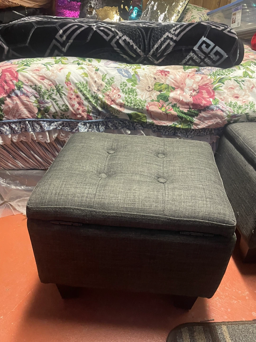 Selling a grey storage ottoman. It’s in great shape and perfect for storing blankets, toys, or anything else you need to tuck away! The lid lifts up easily, and the inside is nice and spacious. One for 20 and two for 35