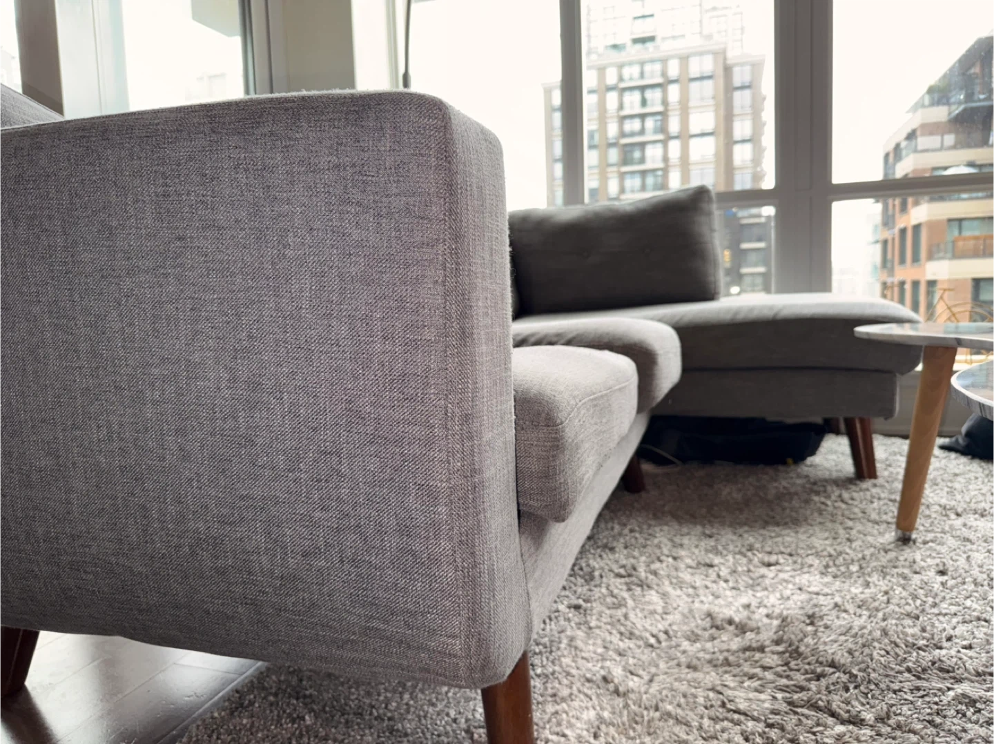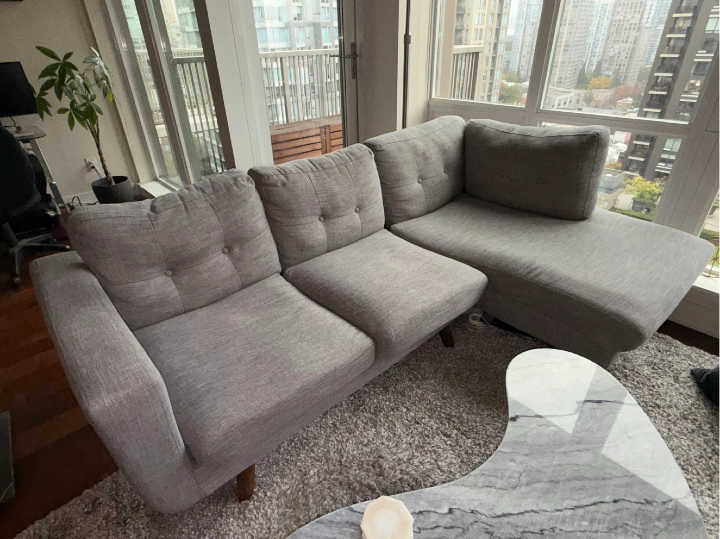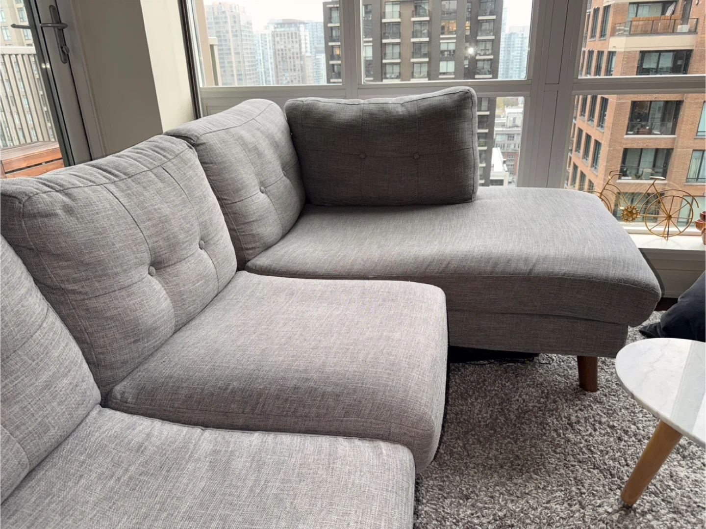 Selling a comfy grey sectional sofa with a chaise lounge. It's in great shape and well kept over the years. The fabric is a nice neutral grey that goes with everything. Retailed for $999 before taxes. 83"W x 35"D x 34"H