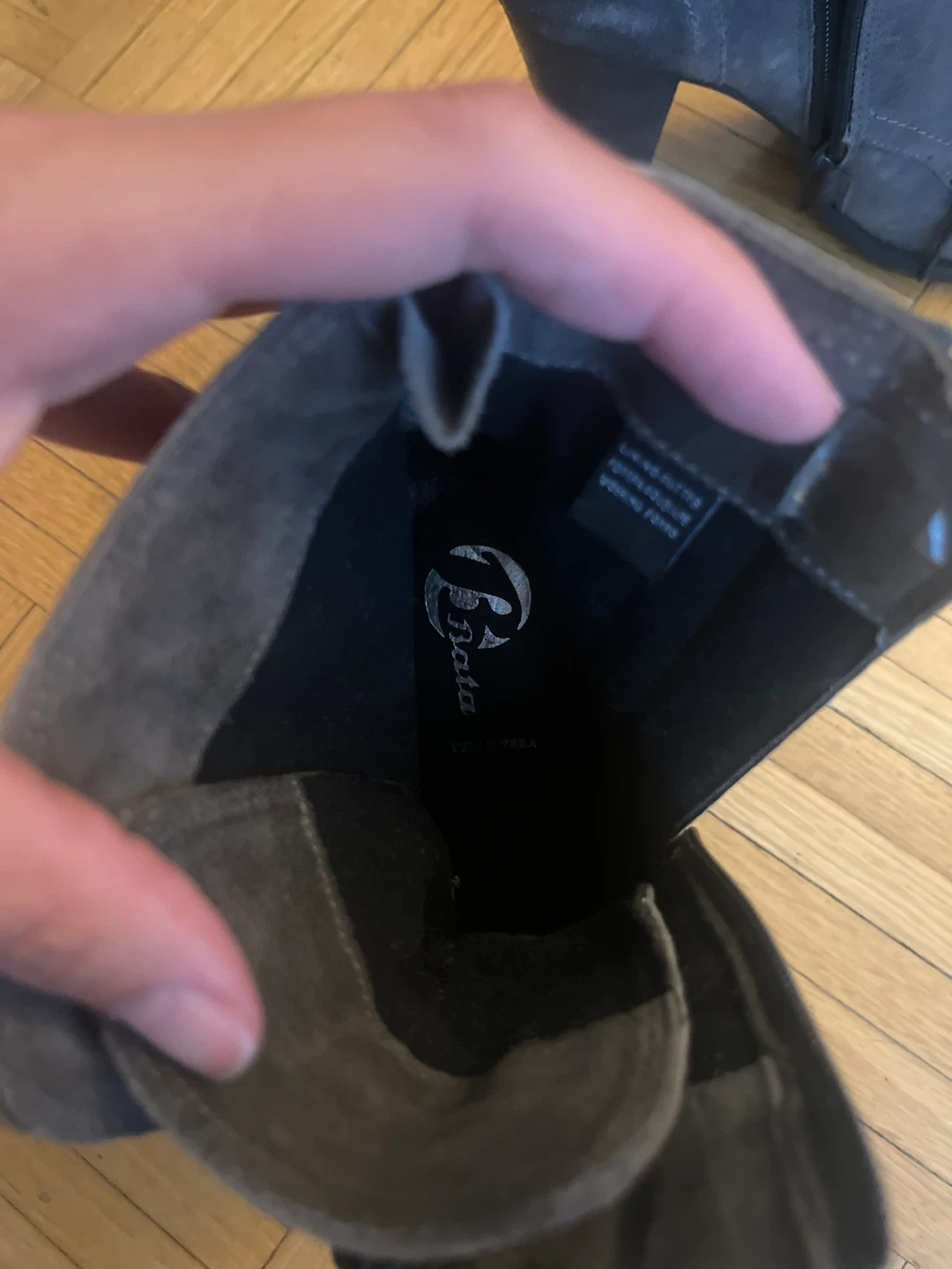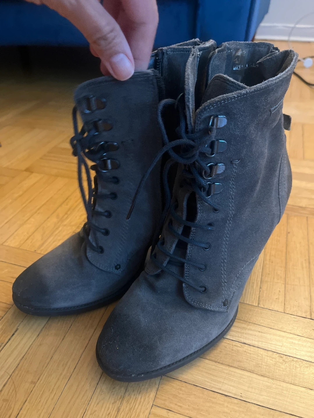 Selling a pair of grey suede ankle boots from Bata (Italian Brand). They feature a lace-up front and a zipper at the back. These boots are a size 8 and are in good condition. Perfect for adding a touch of style to any outfit!