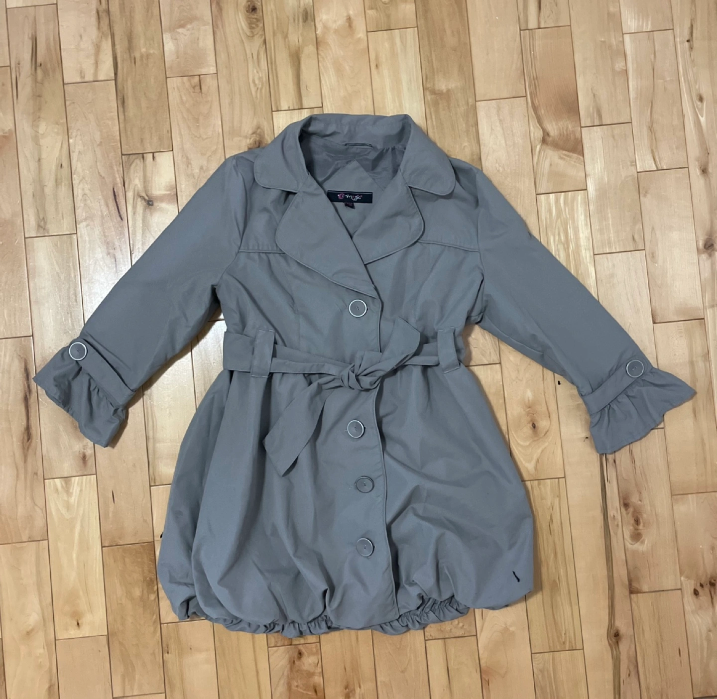 203/4 sleeve grey trench coat with a belt and button closure. The coat has a ruffled hem and a bubble shape.