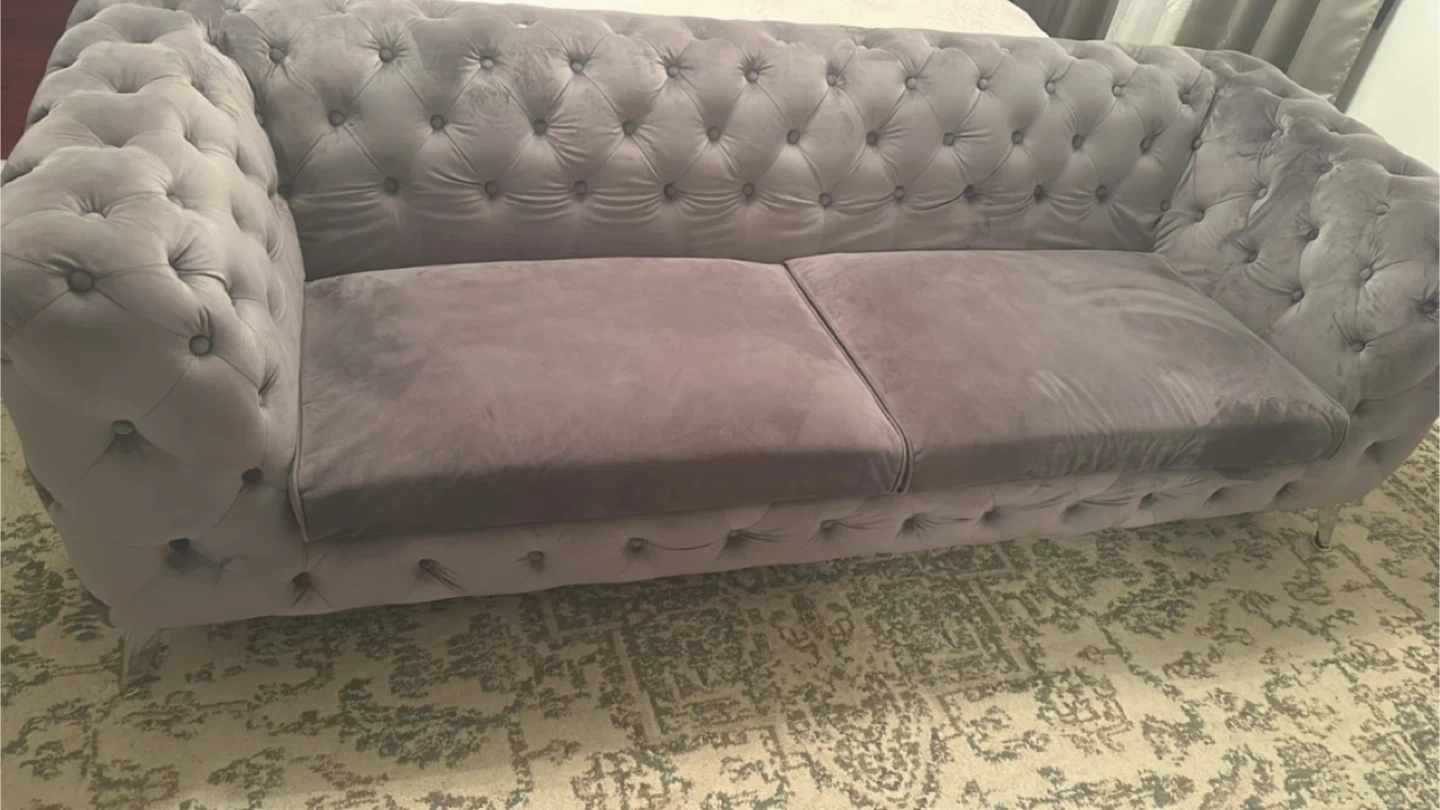 10Selling a lovely grey tufted Chesterfield sofa. It's in great condition and would look fantastic in any living room or den. The velvet material is soft and inviting, perfect for lounging. The tufted design adds a touch of elegance and sophistication to the overall look