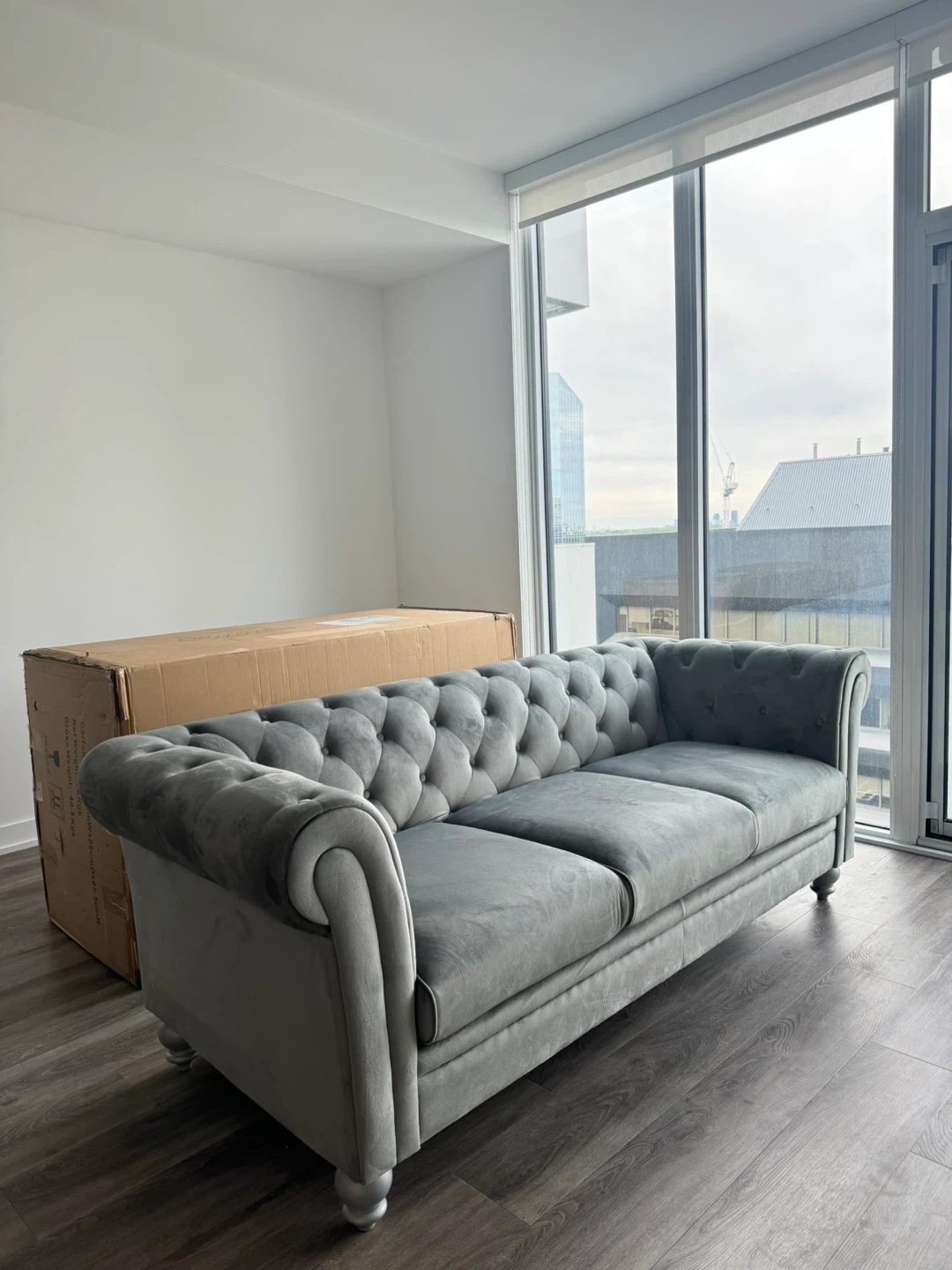Selling a lovely grey tufted sofa! It's in great condition and ready for a new home. This stylish sofa features a classic tufted design and is sure to add a touch of elegance to any living space