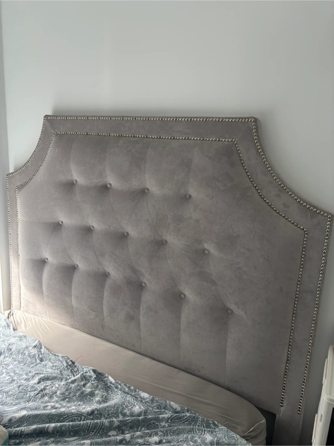 Selling a lovely grey tufted headboard. It's in great condition and would add a touch of elegance to any bedroom. The upholstery is soft and the tufting gives it a classic look. It features silver nailhead trim along the edges.
