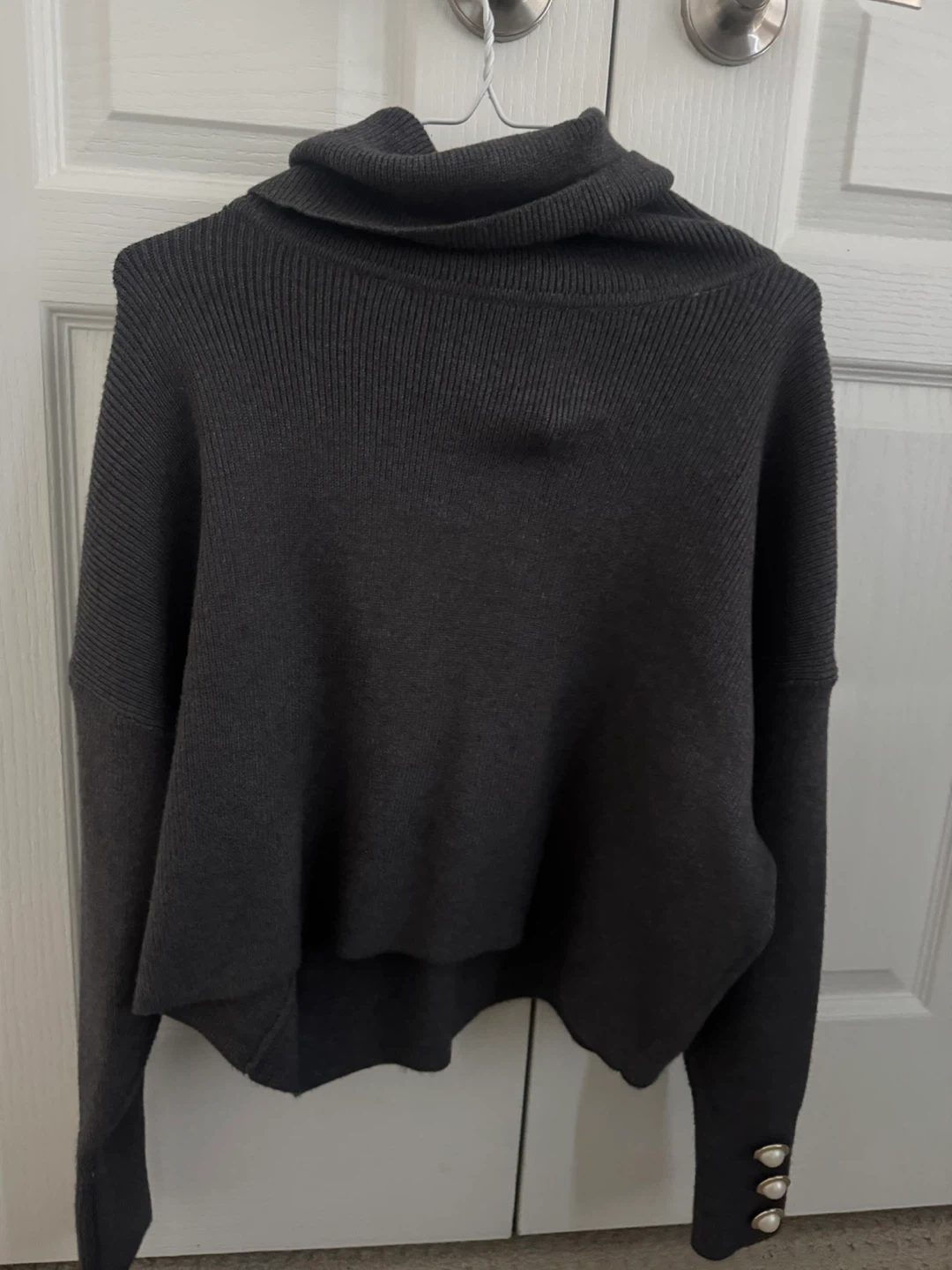 Cozy grey turtleneck sweater with pearl button details on the sleeves! It's a lovely piece for layering or wearing on its own during cooler days. The material is soft and comfortable, perfect for everyday wear. It's in great condition and ready for a new home! Pricing can we changed please contact!