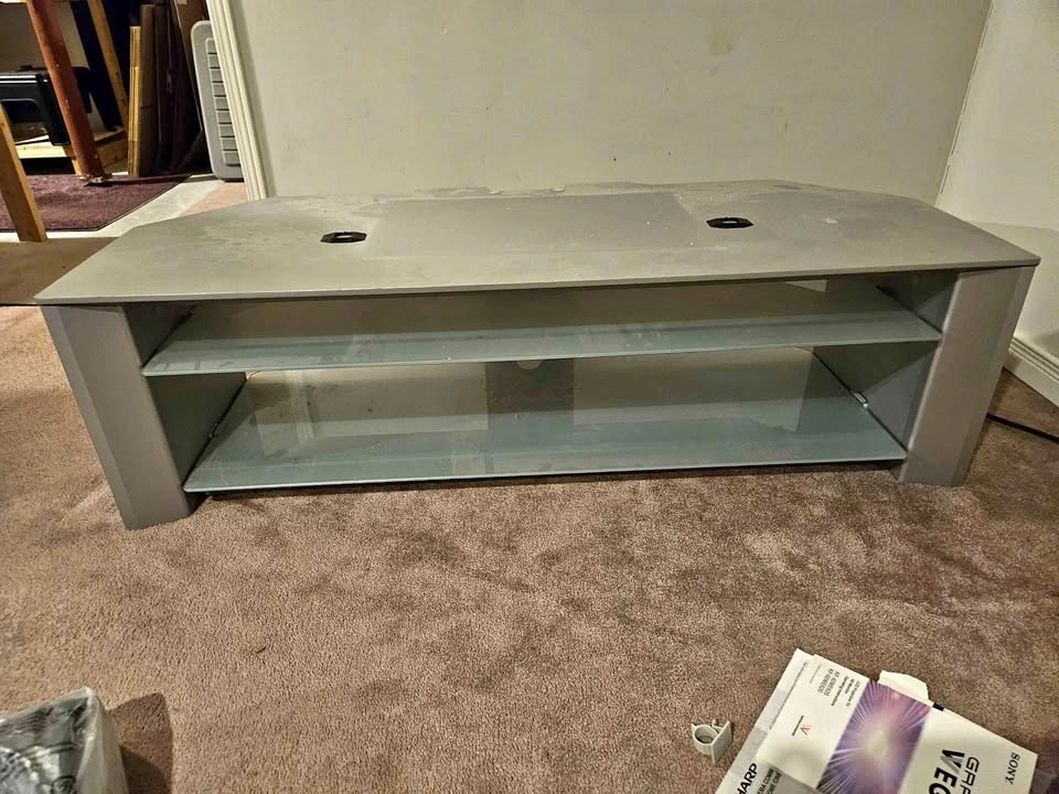 19Selling a grey TV stand that's perfect for your living room setup! It features sturdy construction and two glass shelves for your media devices or decor. It’s in good condition and ready for a new home.
