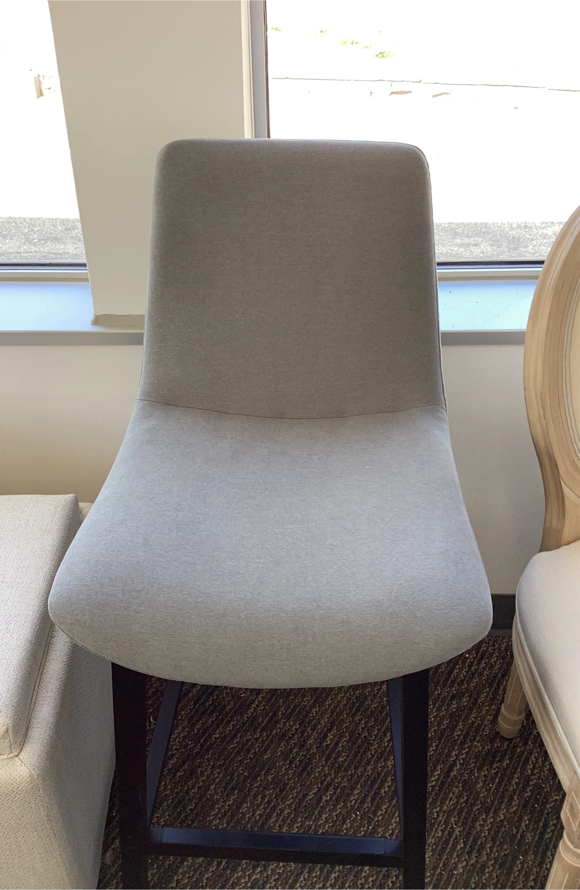 Selling a bar stool with a grey upholstered seat and back. The legs are a dark colour. It's in good condition and would look great in any kitchen or bar area