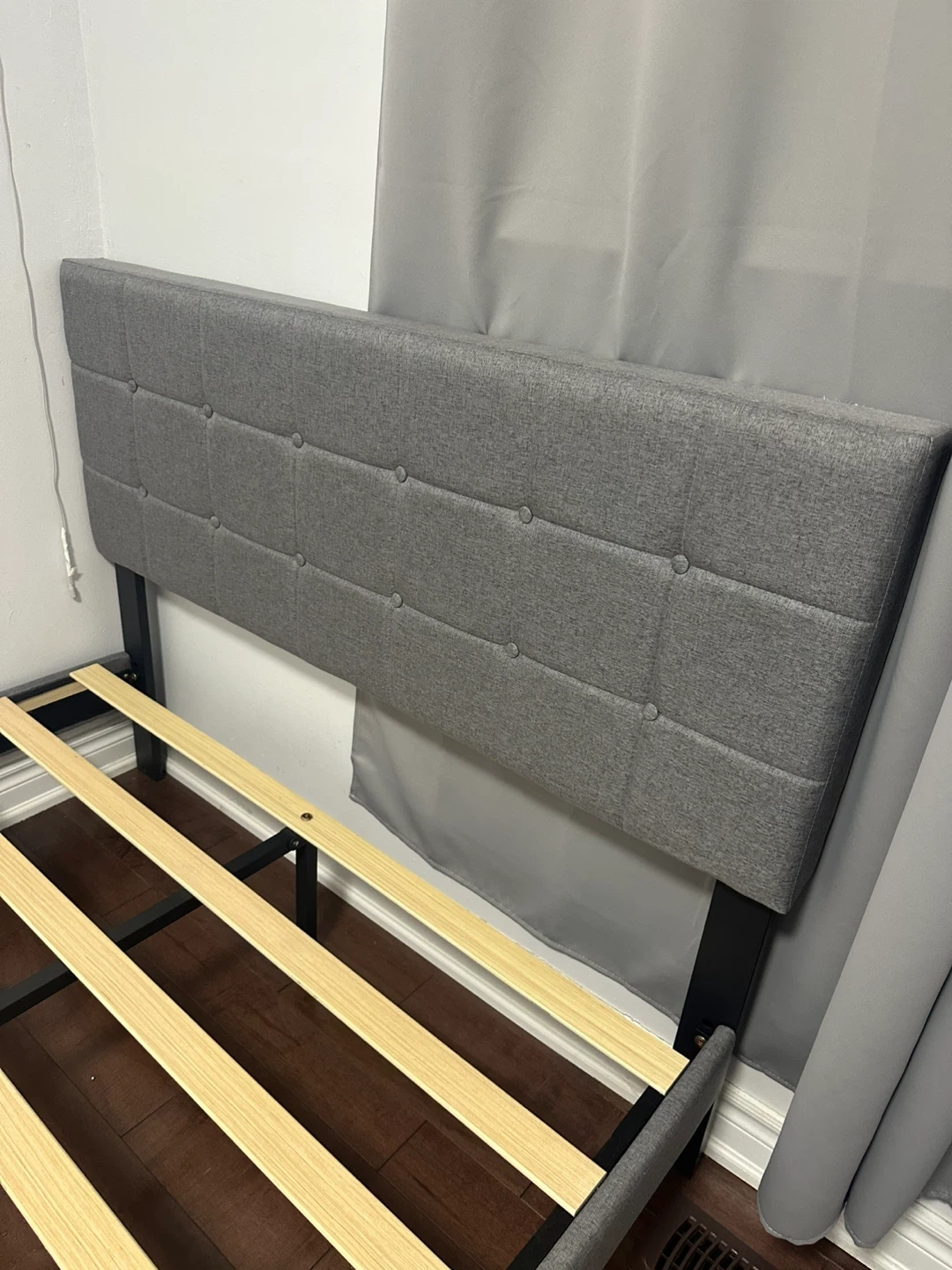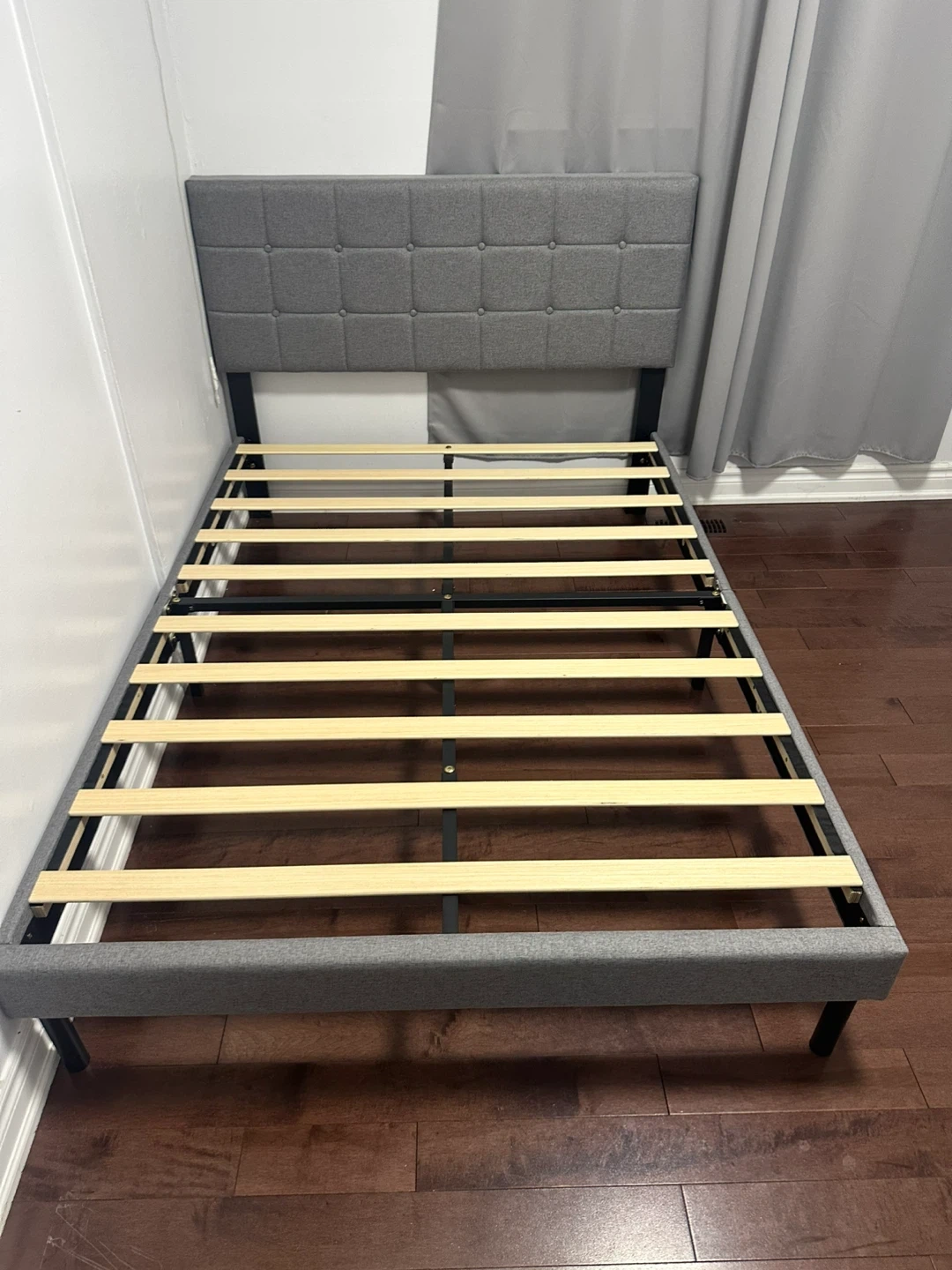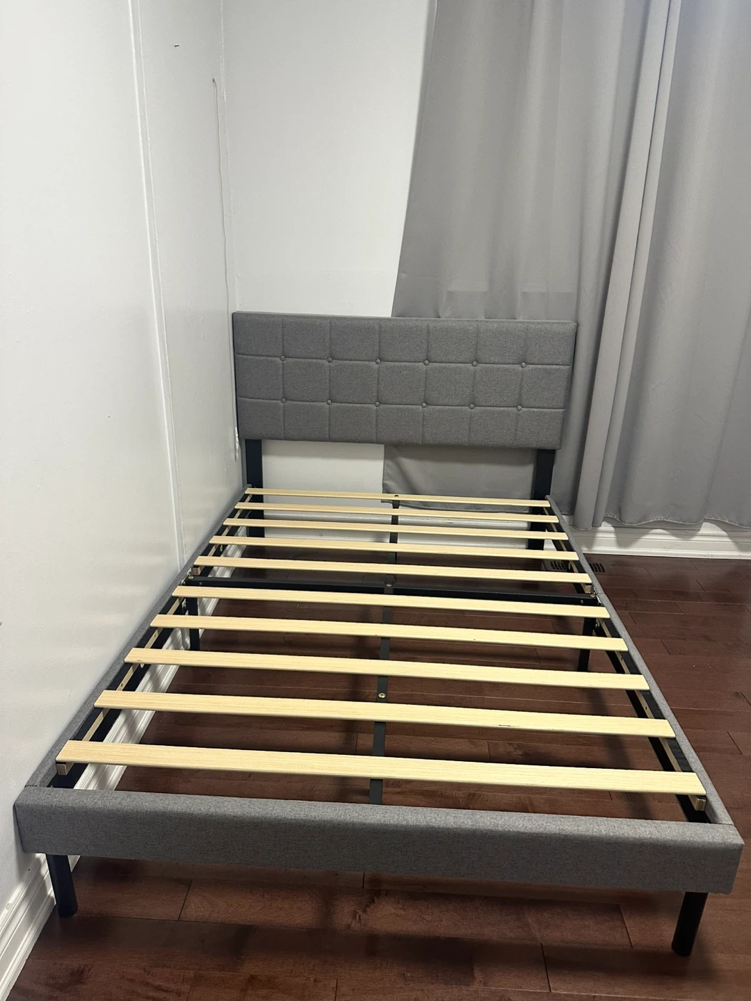 10Selling a full bed frame with a grey upholstered headboard. It's in great condition and ready for a new home! The frame is sturdy and the headboard adds a touch of style to any bedroom. No box spring needed. Can provide delivery across North York.