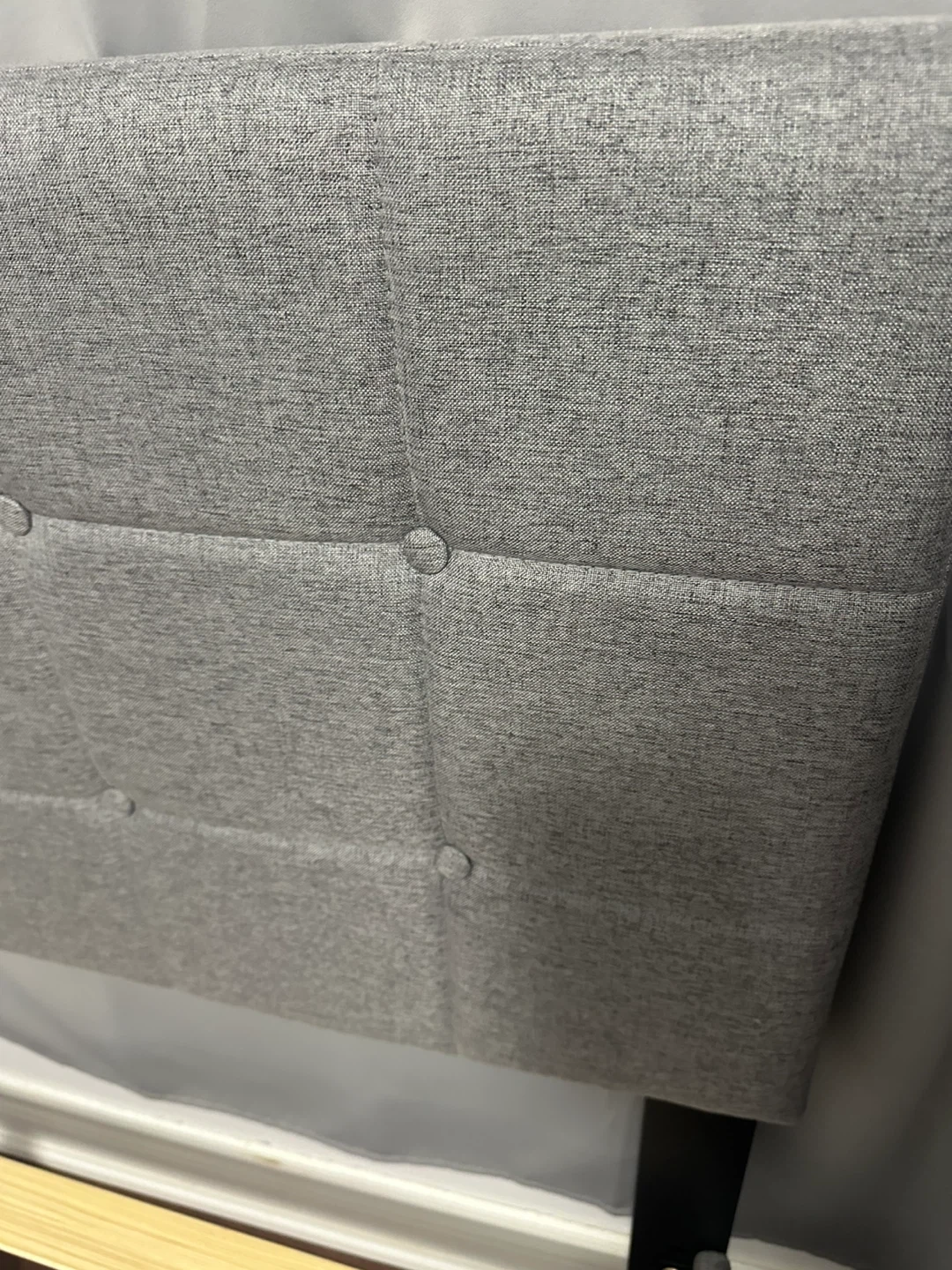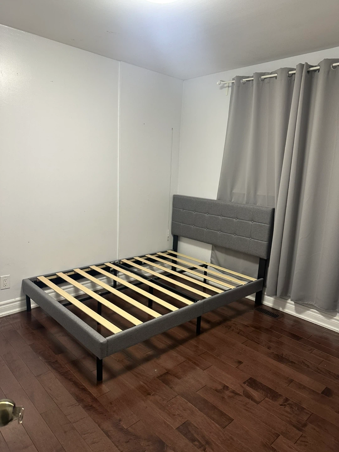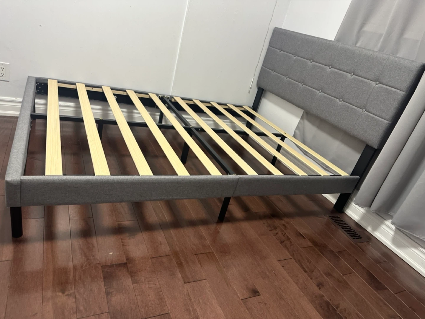 10Selling a full bed frame with a grey upholstered headboard. It's in great condition and ready for a new home! The frame is sturdy and the headboard adds a touch of style to any bedroom. No box spring needed. Can provide delivery across North York.