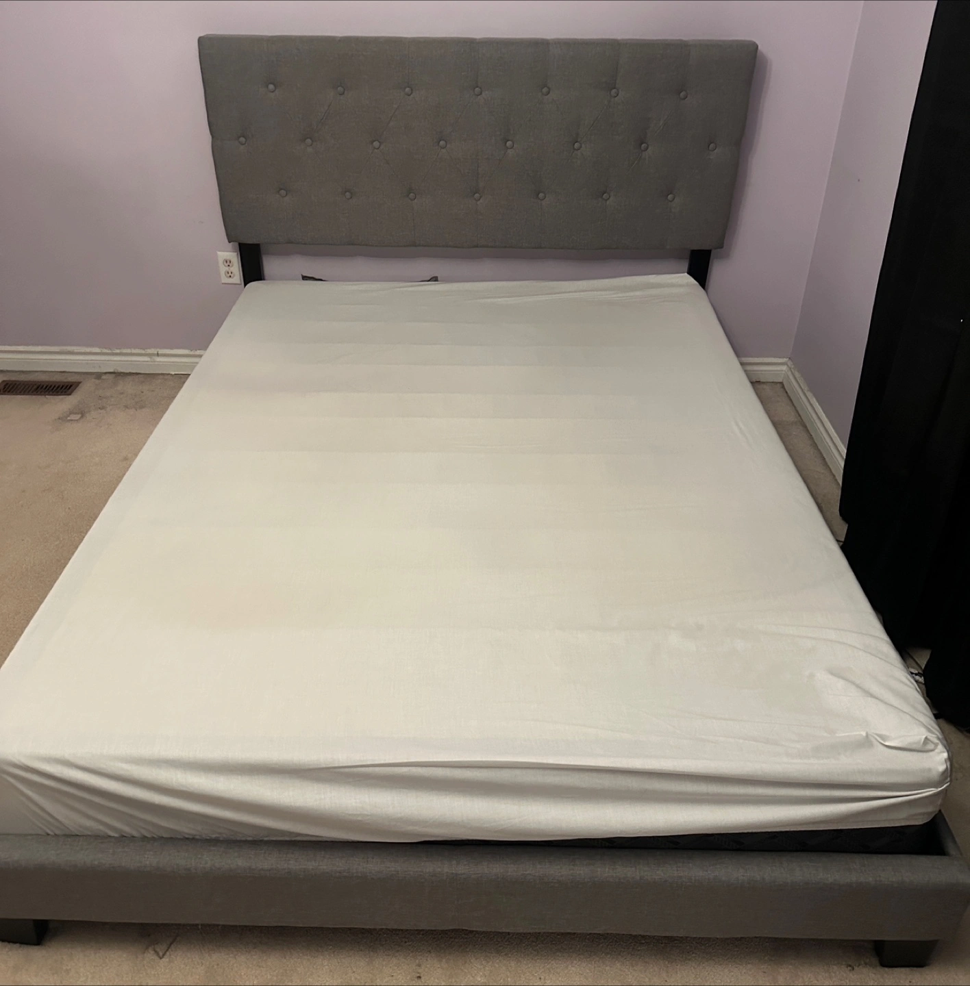 Selling a grey upholstered bed frame only (mattress excluded). It's in good condition and would look great in any bedroom. The headboard is tufted, adding a touch of elegance. Feel free to reach out if you're interested!