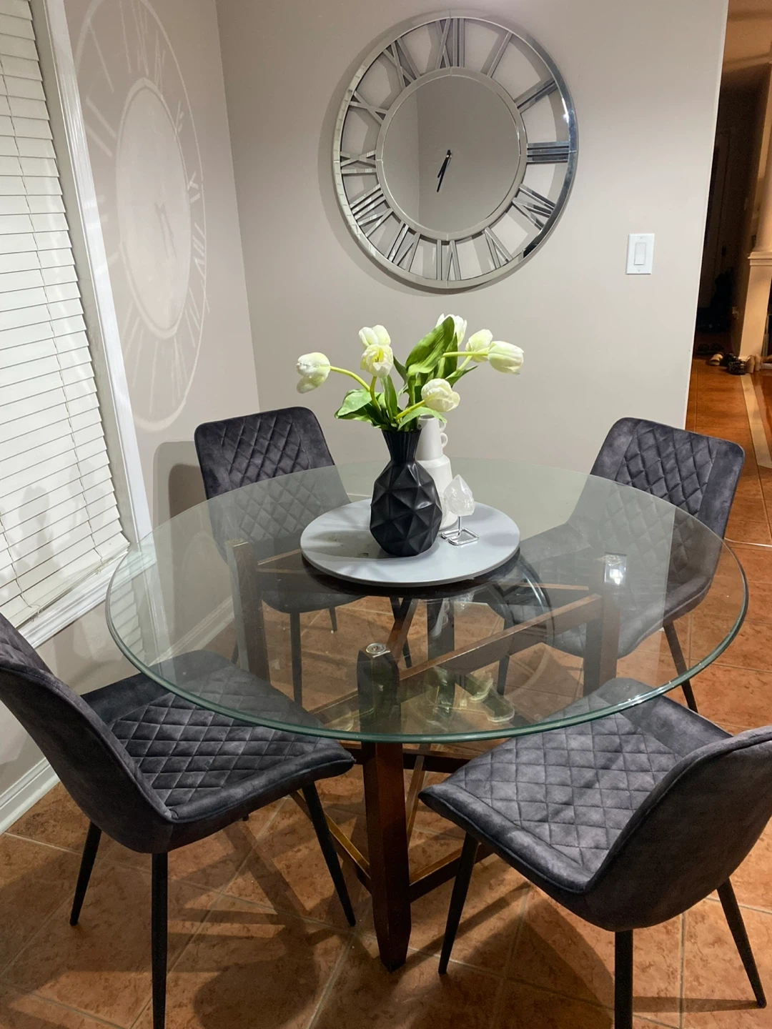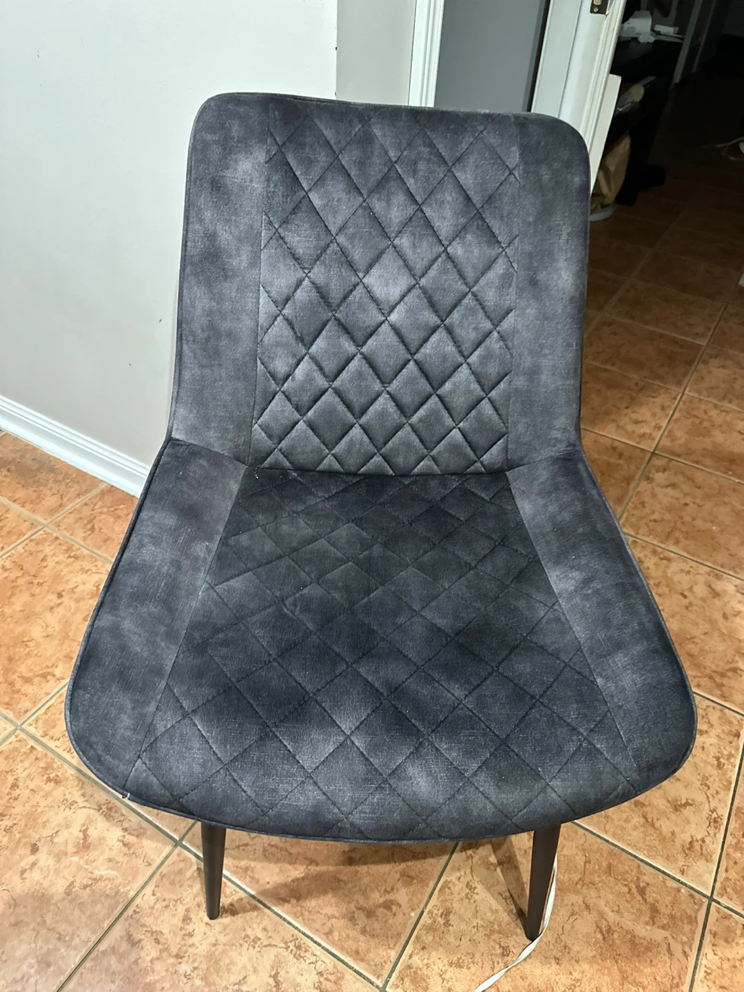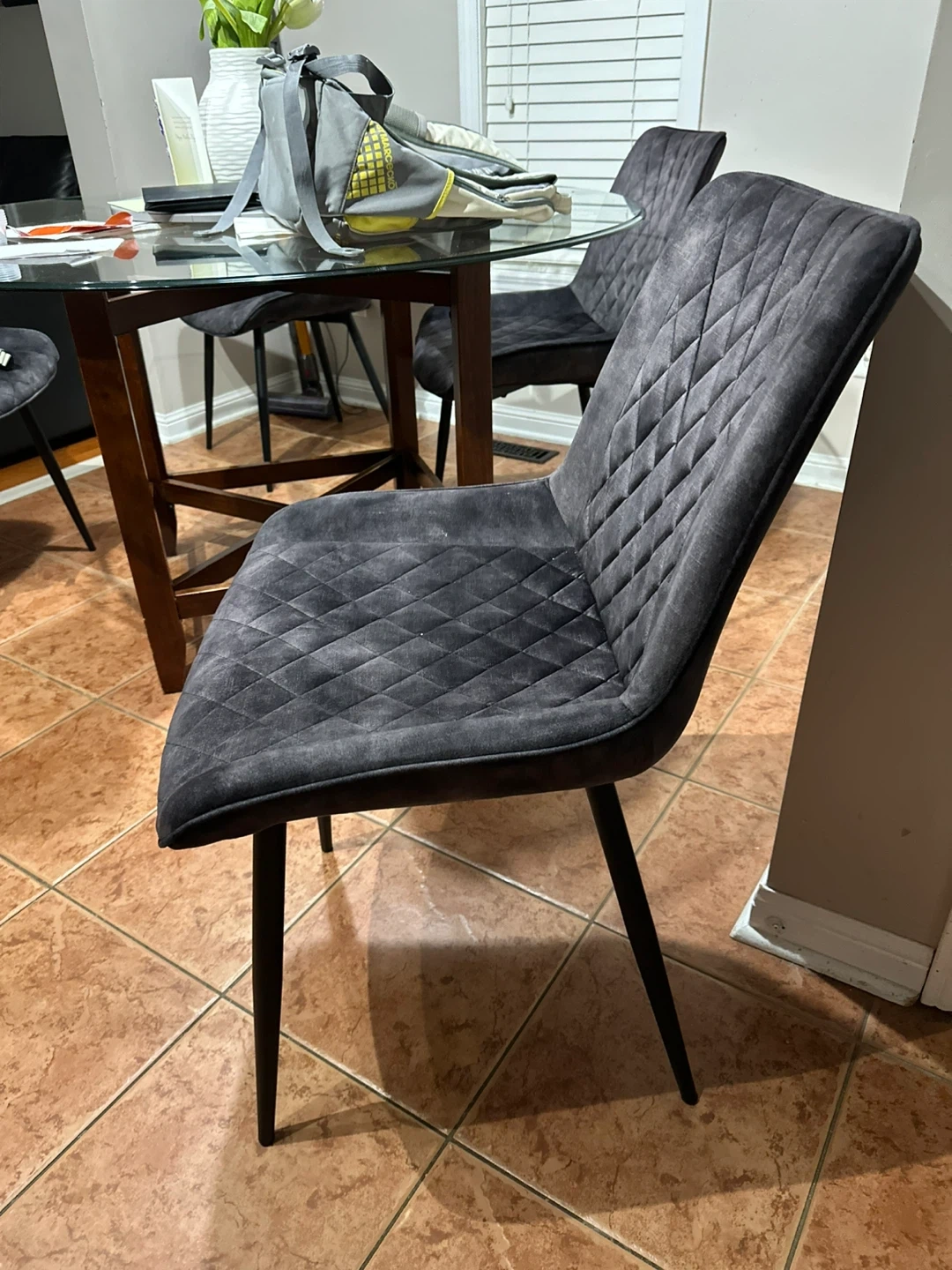 20Selling a set of lovely grey velvet dining chairs! They have a nice quilted pattern on the seat and back. These chairs would look great in any dining room or kitchen. They are in great condition and ready for a new home! $75 per chair
