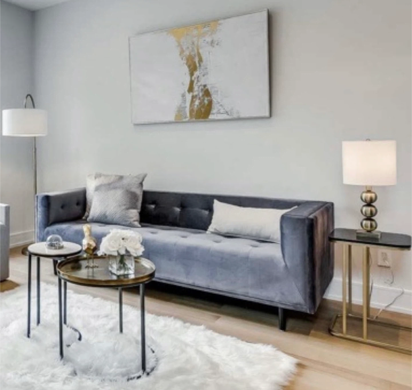 10Selling a lovely grey velvet sofa! It's in great condition and measures 84 inches in length. The material is soft velvet. Perfect for adding a touch of elegance to your living space- used for staging only -