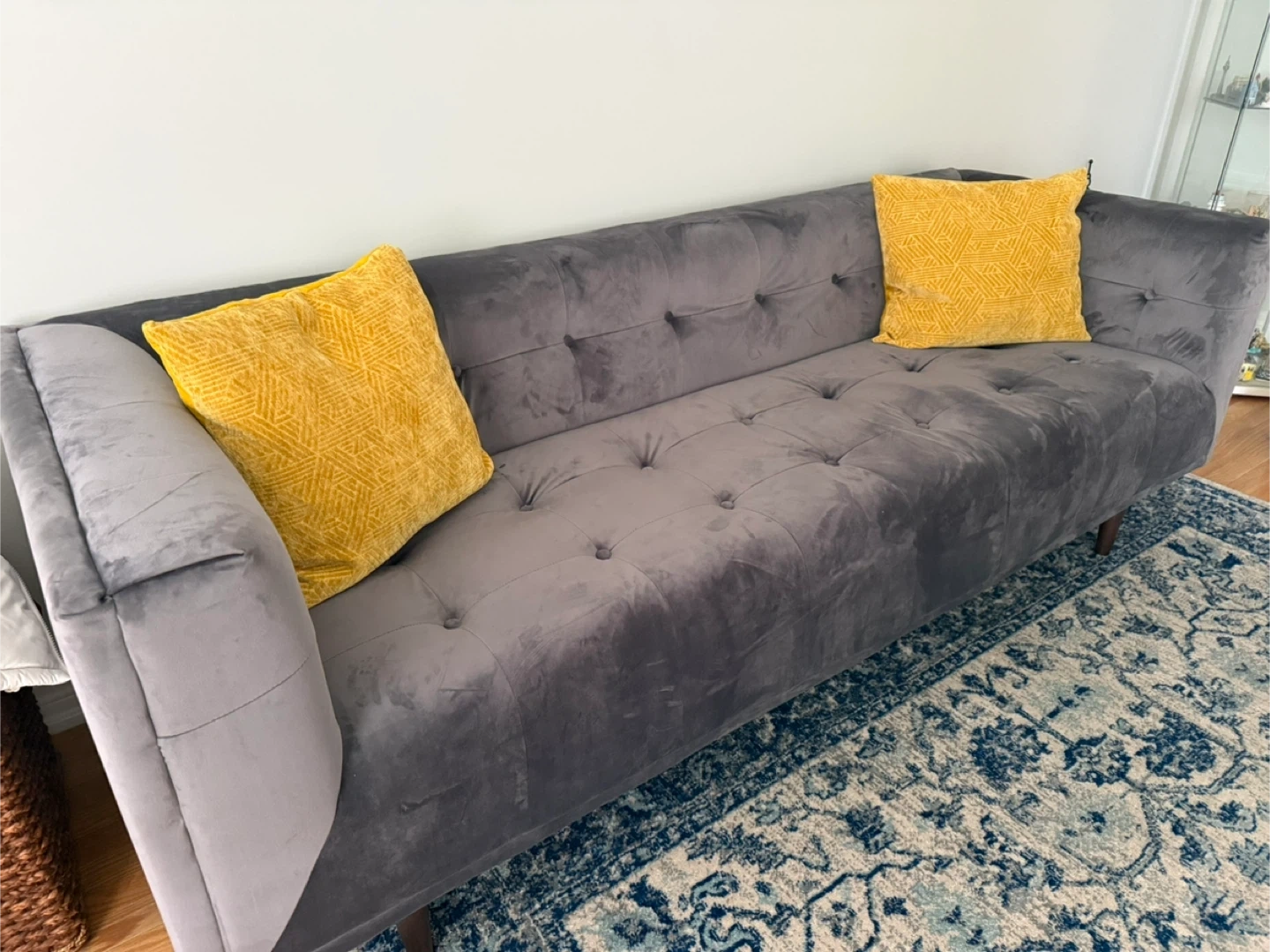 18This is the Loretta mid-century modern velvet 3-seater sofa from Structube. This sofa is known for its tufted design, plush velvet cushions, and high arms, which give it a sophisticated, timeless silhouette. It is made with a robust wooden frame and is available in various colors. Key features: Style: Mid-century modern. Material: Velvet. Design: Button-tufted backrest and seat. Dimensions: Approximately 83 inches wide, 32 inches deep, and 30 inches high. Seating: 3-seater.