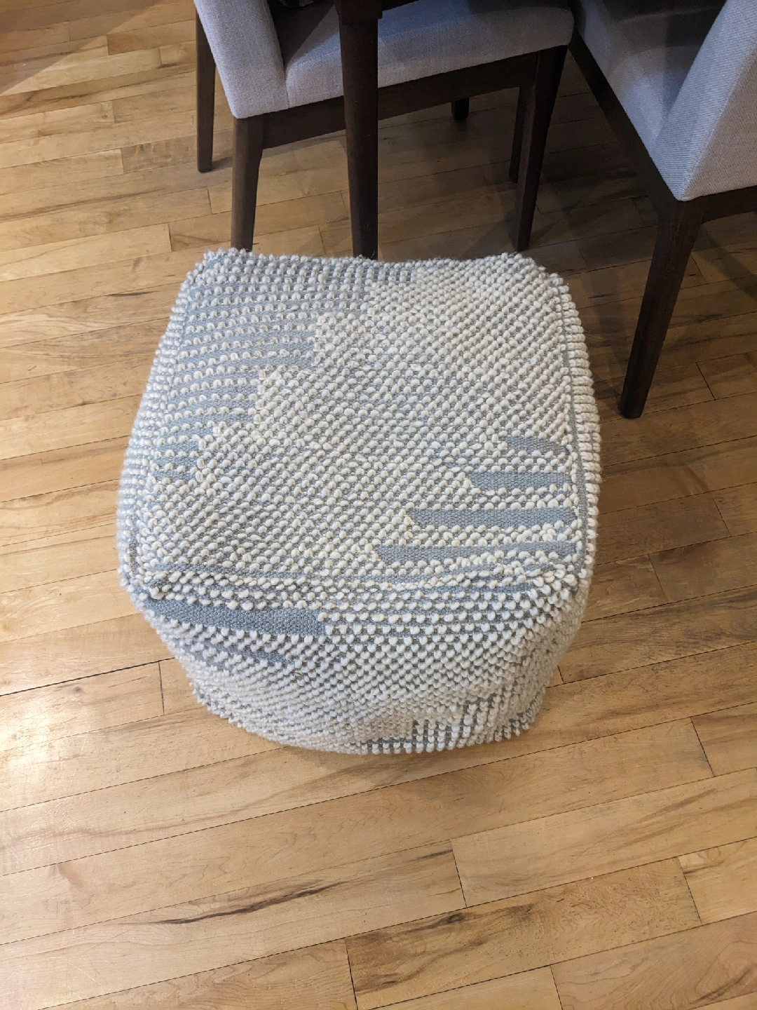 10Add a touch of cozy style to your space with this pouf ottoman! It features a textured grey and white design that would look great in any living room or bedroom. Perfect as a footrest or extra seating