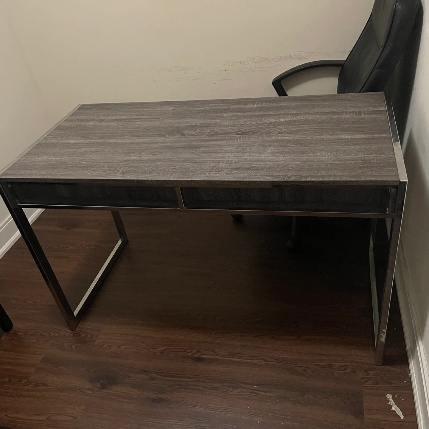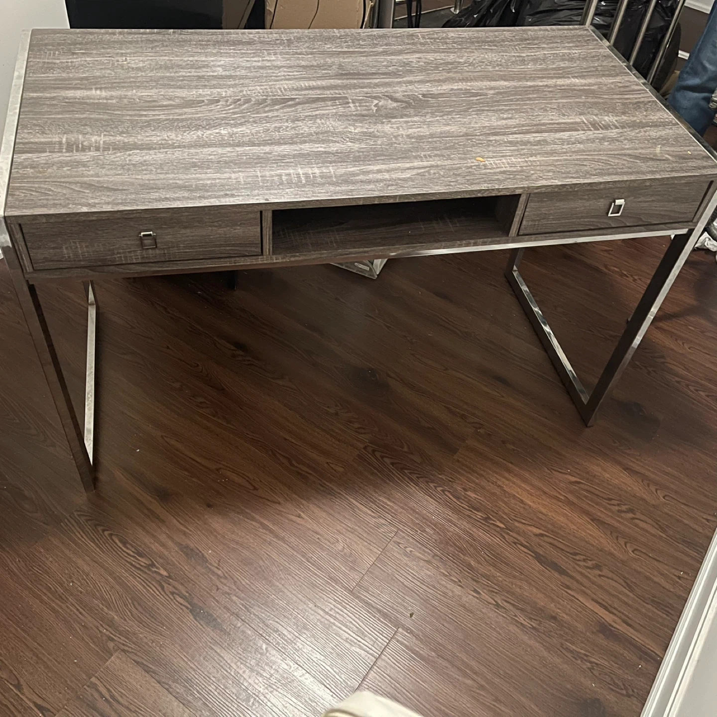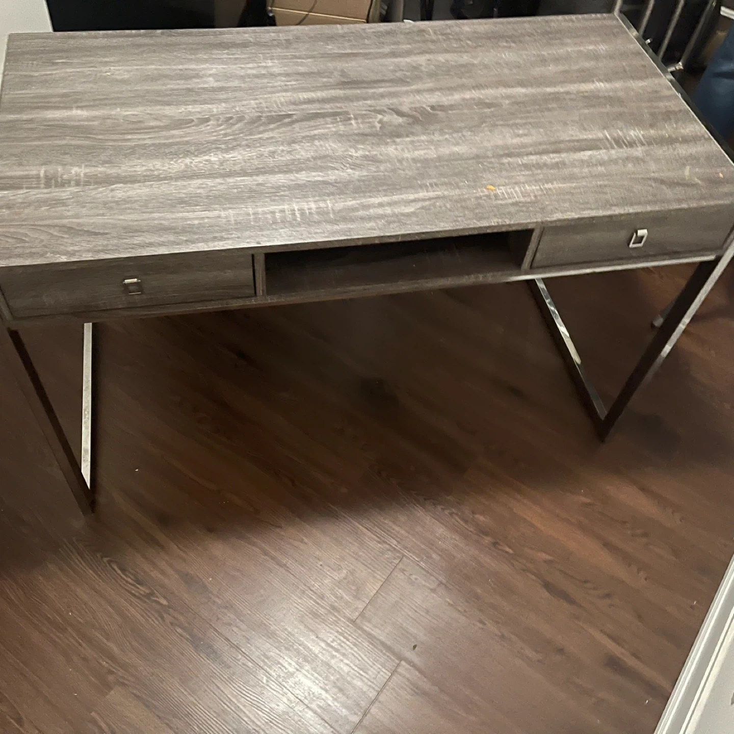 20Selling a desk with a grey wood top and metal legs. It has a sleek, modern look and would be great for a home office or study space. It features drawers for storage to keep your workspace tidy. Perfect for anyone needing a stylish and functional desk!