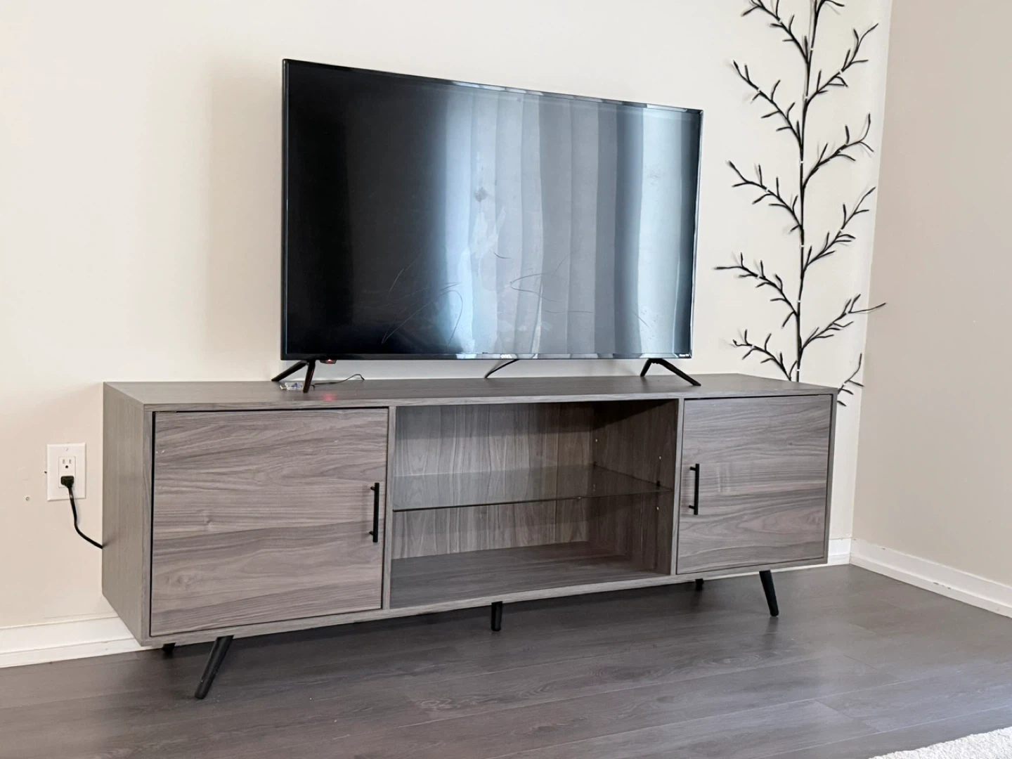 Selling a TV stand with a lovely grey wood grain finish! It features two doors and open shelving with glass shelves in the middle. Perfect for your living room or entertainment area