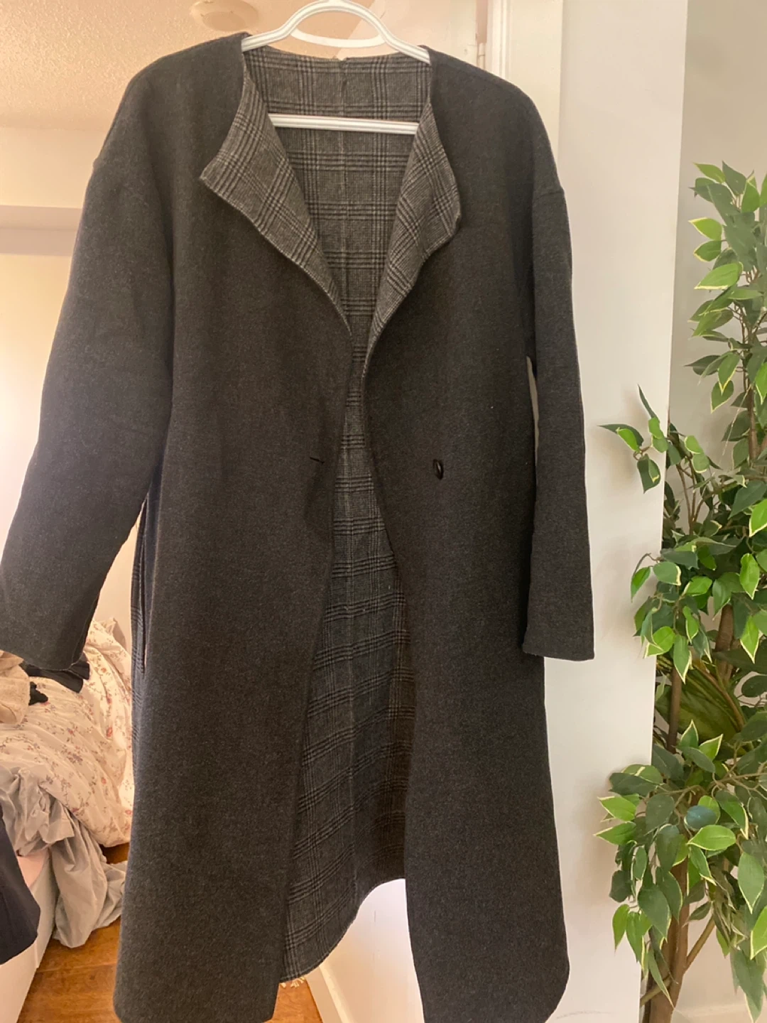 Selling a lovely grey Uniqlo wool blend coat that’s reversible! One side is solid grey, and the other has a stylish grey plaid pattern. It also features a tie waist for a flattering fit. Perfect for adding a touch of elegance to your wardrobe