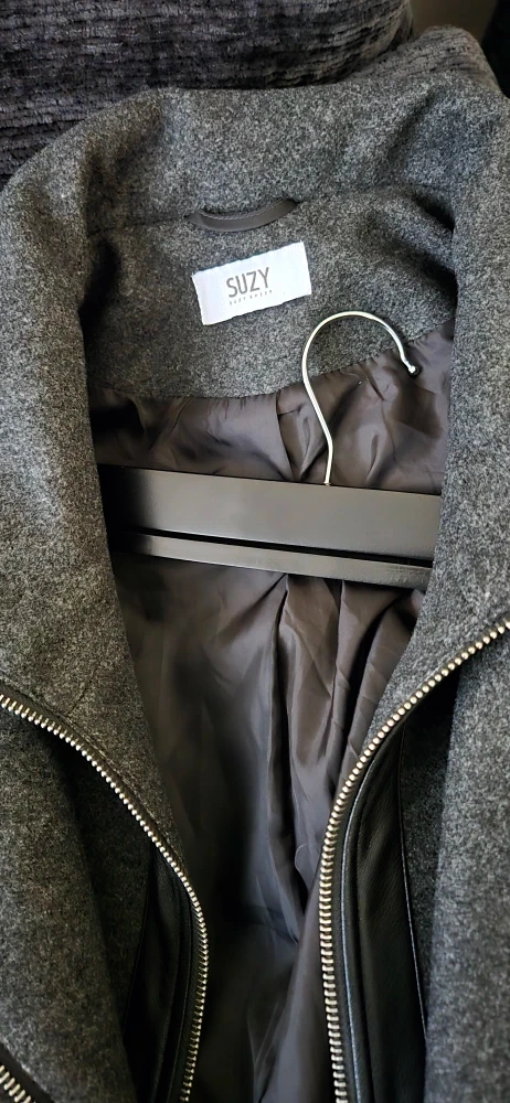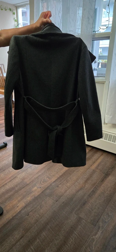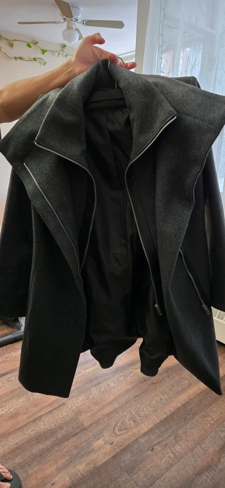 Selling a stylish grey coat, perfect for cooler weather! It's made from a wool blend and features a unique collar with a zipper detail. The coat also has a belt to cinch the waist. It's in great condition and ready for a new home